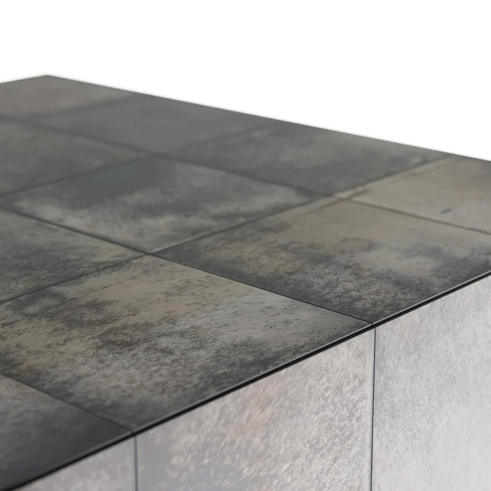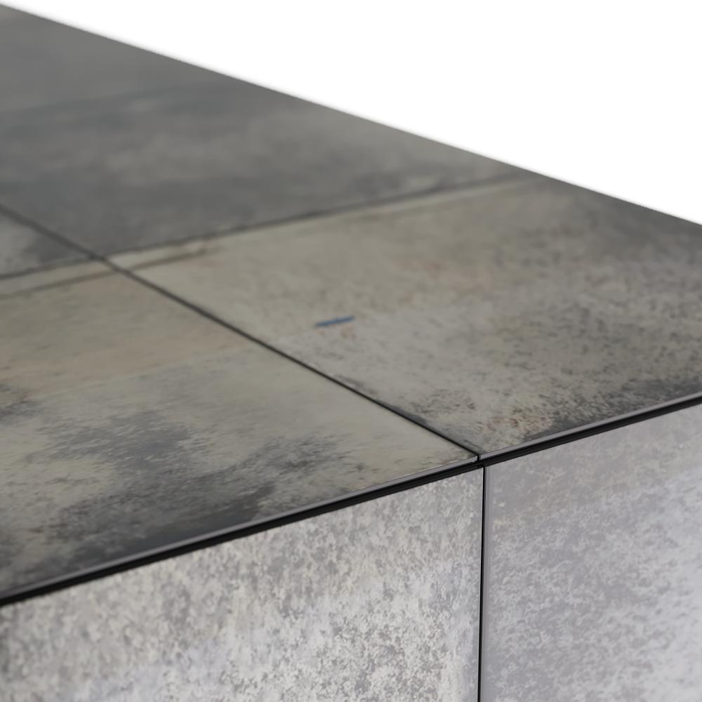 The vintage allure of watercolor design inspired the finish of our antiqued-finished coffee table. The top and sides are wrapped around in a grid pattern floating on a bronzed iron base. Antiquing willv vary.