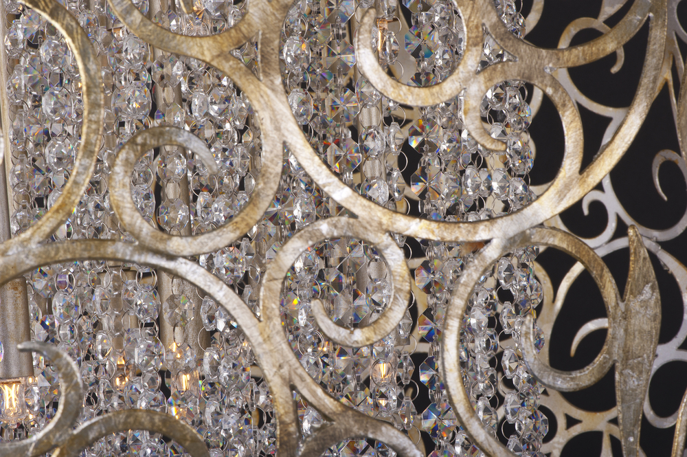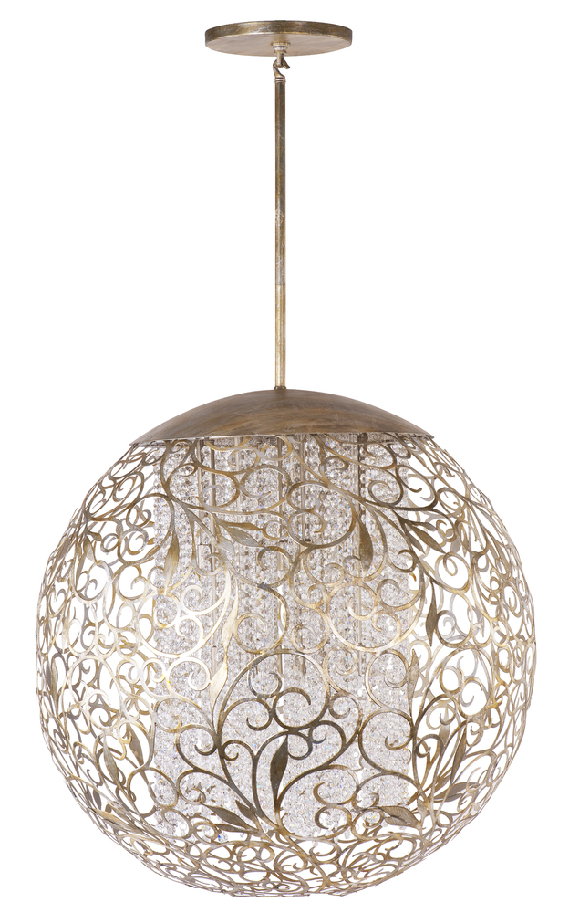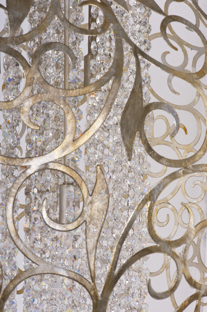 The Arabesque collection's intricate patterns are formed in metal and finished in Golden Silver. Strands of crystal beads add sparkle as they shimmer through the Xenon lamps. Unique oval-shaped pendants add a touch of class to any room.