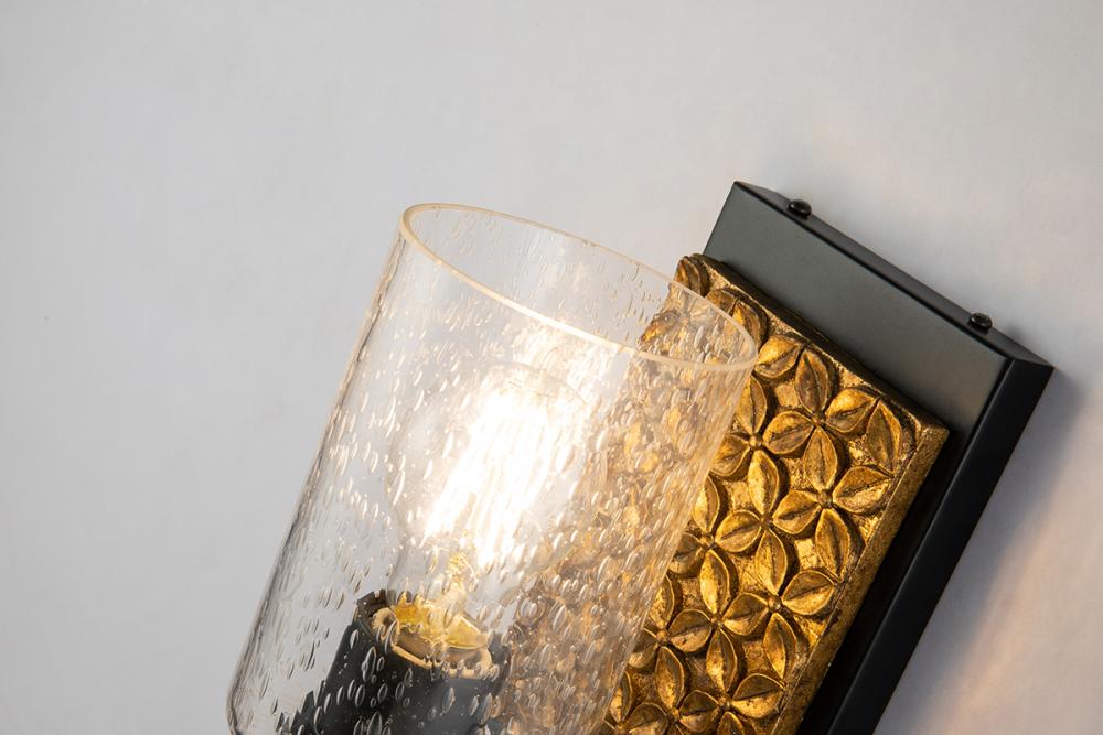 A sconce with a textured rectangle backplate in matte black and antiqued gold. Its cylinder seeded glass adds contemporary charm from the Arcadia collection to any room.