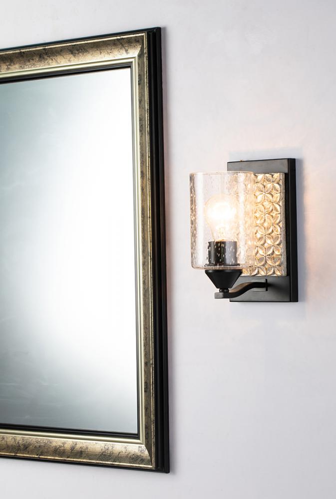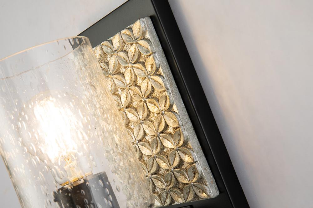 A sconce with a textured rectangle backplate in matte black and antique silver. Its cylinder seeded glass brings contemporary style from the Arcadia collection to any room.