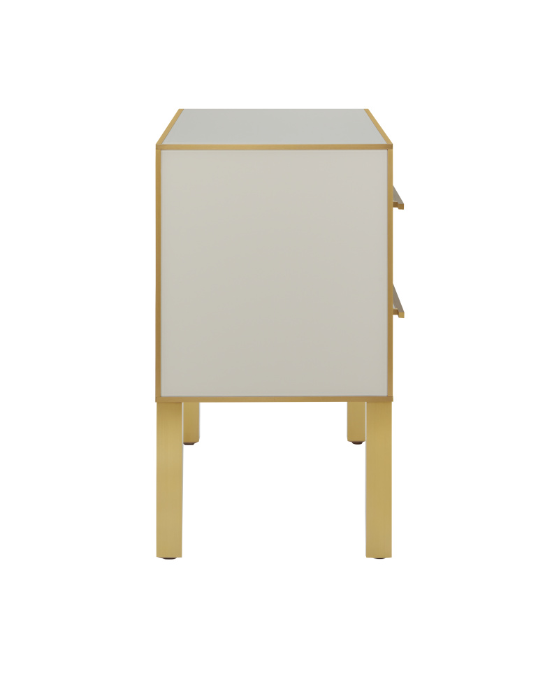 The Arden Ivory Chest is inspired by a 1970s reverse-painted glass antique our found at the Paris flea market. The chest features ivory reverse-painted glass panels on the top, front, and sides with solid brass trim, hardware, and legs. The ivory and gold chest has a beveled top, and drawers with soft-close glides.