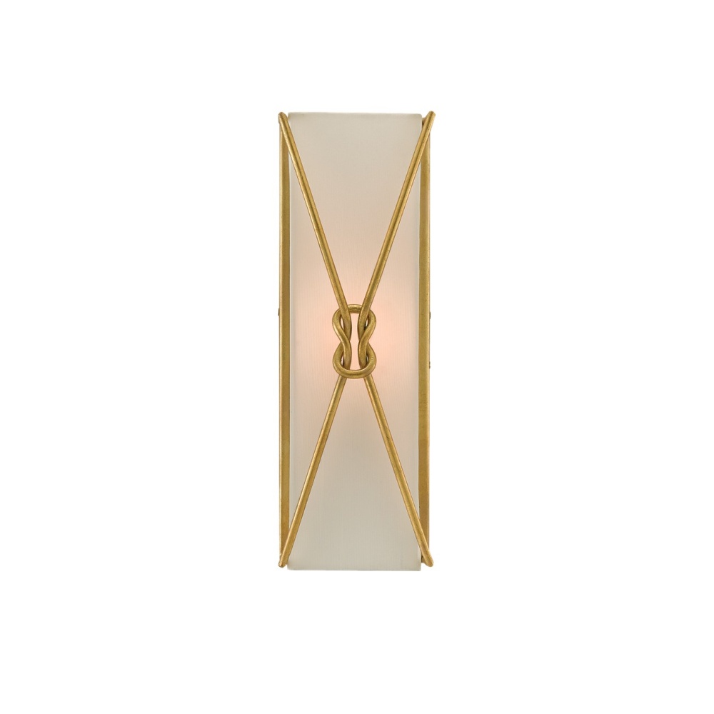 Mythology has some knotty tales, the one Theseus inhabited a circuitous one. Thankfully he was loved by an immortal who helped him escape the labyrinth, a woman just as clever as our namesake Ariadne Wall Sconce with its looping knots and sexy swagger. The body of this rectangular version of this fixture is made of wrought iron that has been treated to a contemporary gold leaf finish. The inset shade that softens the light source is made of off-white shantung. This sconce joins a number of pieces in our Ariadne offerings.