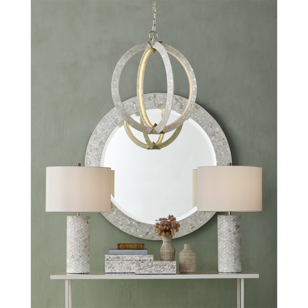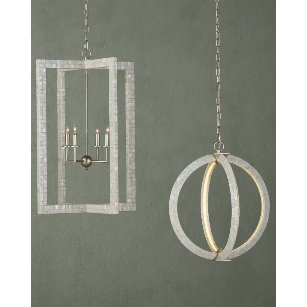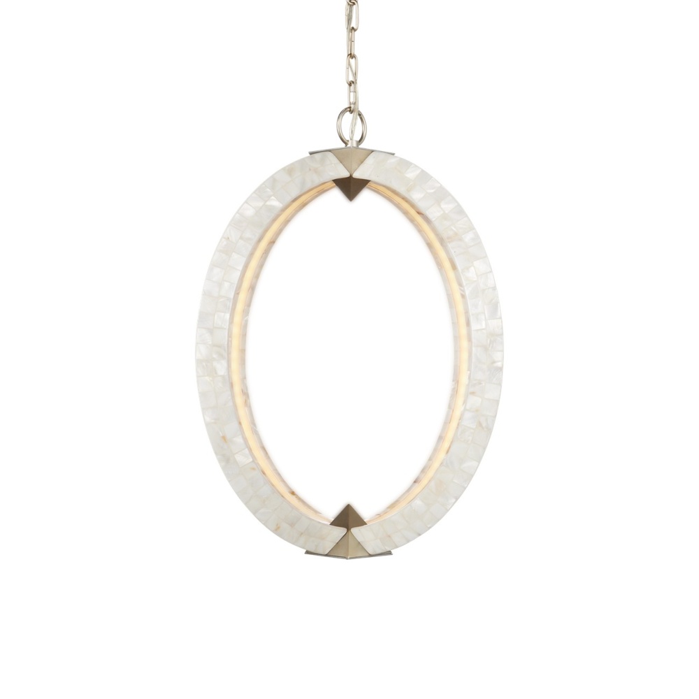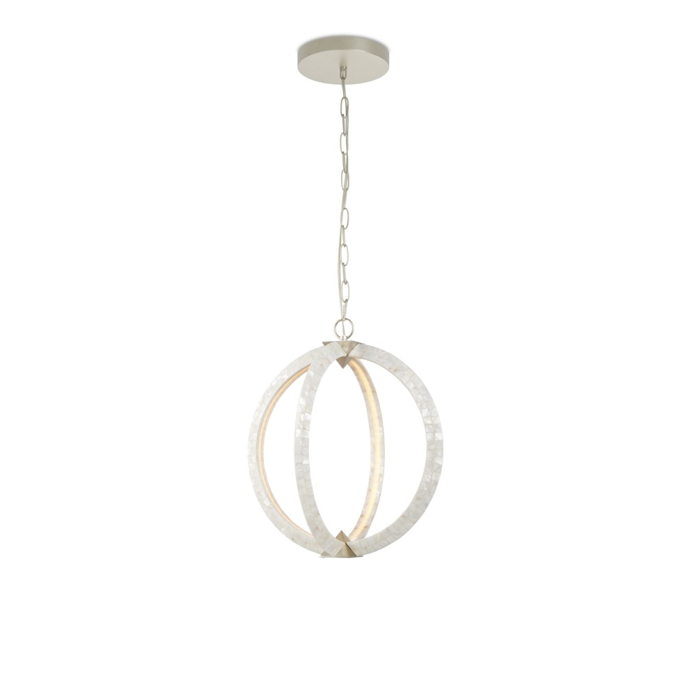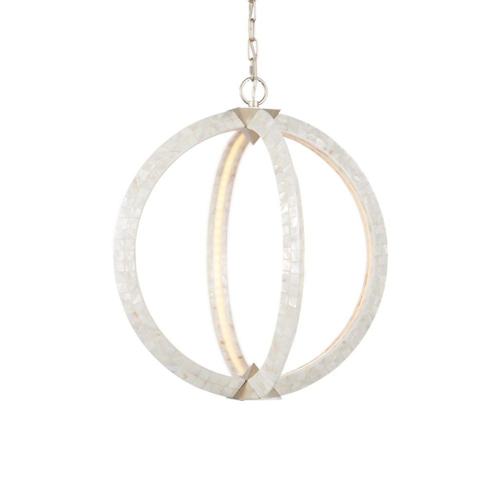 A stunning creation, the Arietta White Orb Chandelier has ribs of metal covered seamlessly in pieces of mother-of-pearl. The integrated LED illumination is recessed inside each of the arcs to bring a uniform brilliance to the fixture. A design statement with this piece are the silver pyramid shapes that connect the arms to create an implied globe. Adjustable from 30.5" to 98" with use of included chain/rod kit/cable. If your space calls for a longer drop, additional chain/rods/cable is available for purchase.