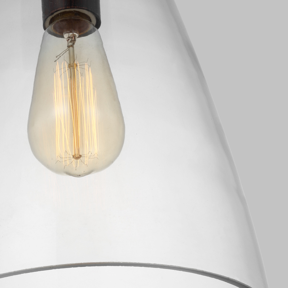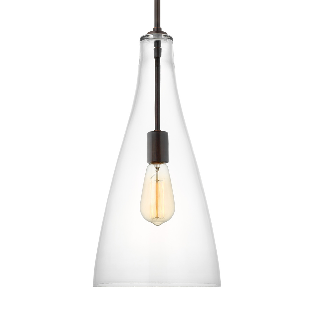The Arilda one light indoor pendant in bronze enhances the beauty of your home with ample light and style to match today's trends. The Arilda one-light pendant collection from springs to life with the fine artistry and technique of hand-blown glass. Spindle-inspired Clear glass shades give dimension and character to these traditional pendant lights. Paired with Edison-style bulbs, this pendant is a period-inspired classic to complement a wide range of decor from Colonial to nautical to rich, European inspired settings. Available in two hardware finishes, Heirloom Bronze and Brushed Nickel, Arilda pendants may be installed as single pendants or clustered in multiples, which would be an ideal installation used for entry lighting, dining room lighting, living room lighting or kitchen lighting over a table.