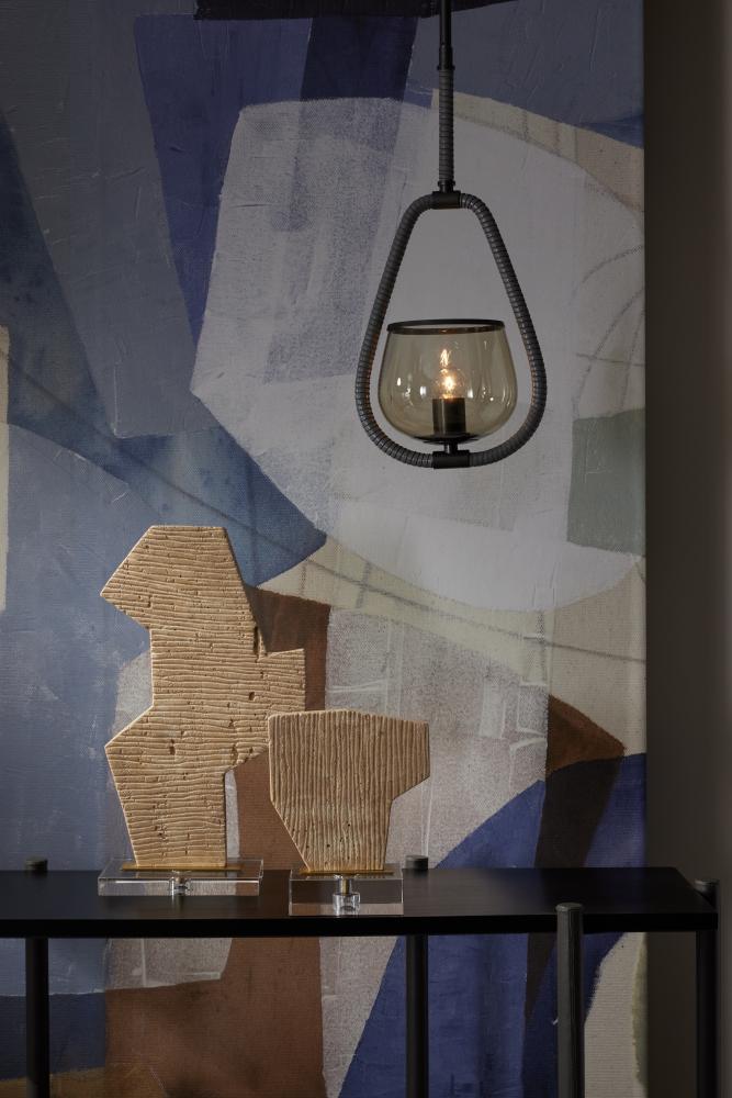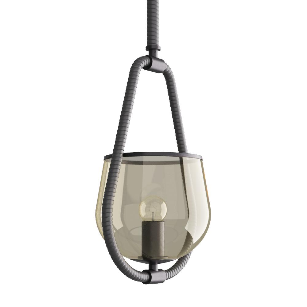 A traditional equestrian stirrup influenced a clever twist on the pendant. Wrapped in graphite leather, its English bronze iron finished post cradles a bowl of smoke glass trimmed with a matching English bronze stripe. Damp-rated, although limited covered outdoor conditions may affect finish. Finish will vary.