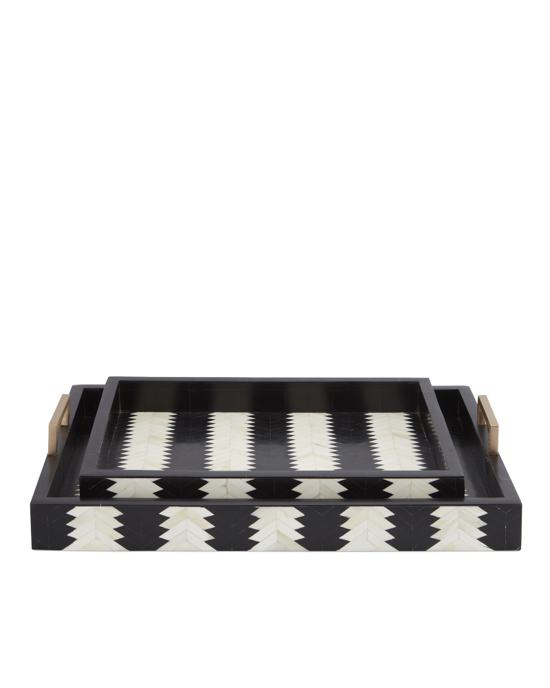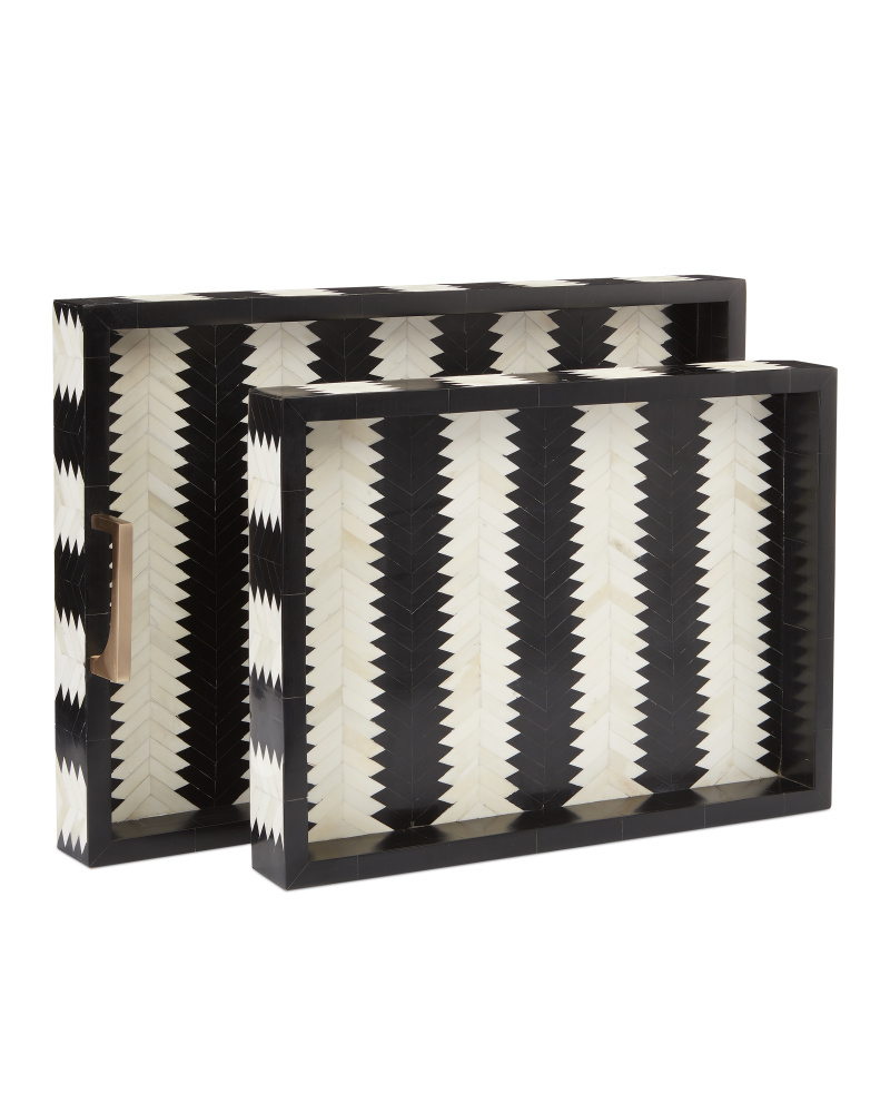 The Arrow Black & White Tray Set, designed by Jamie Beckwith, is based on a strong graphic shape that comes alive with the contrast of bone and composite in ivory and black along the surface. Originally created in bold patterns for vertical and horizontal surfaces, Beckwith says of the Arrow, "This is a unique take on a chevron pattern. I was inspired by original French chevron parquets and this pattern is an updated version of that. There is a classic feel to this graphic shape with a modern take. It provides a strong underlying structure that bonds all the elements of a room together."