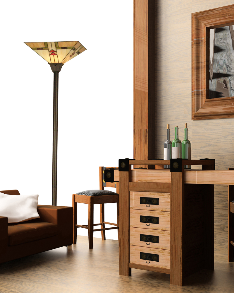 For a striking addition to your living room, den, study, or office you cannot go wrong with the straightforward style of this modern torchiere. Classic mission style with a modern twist, light amber triangular and rectangular panes have been accented with twin deep red arrowheads at the center of each panel. Each corner features dark amber panels, surrounded by light and dark olive green. The base has a graduated pedestal and is finished in mica bronze, which beautifully harmonizes with the color palette in the shade. A wonderful complement to any decor style, this torchiere will provide you with years of beautiful, reliable service.