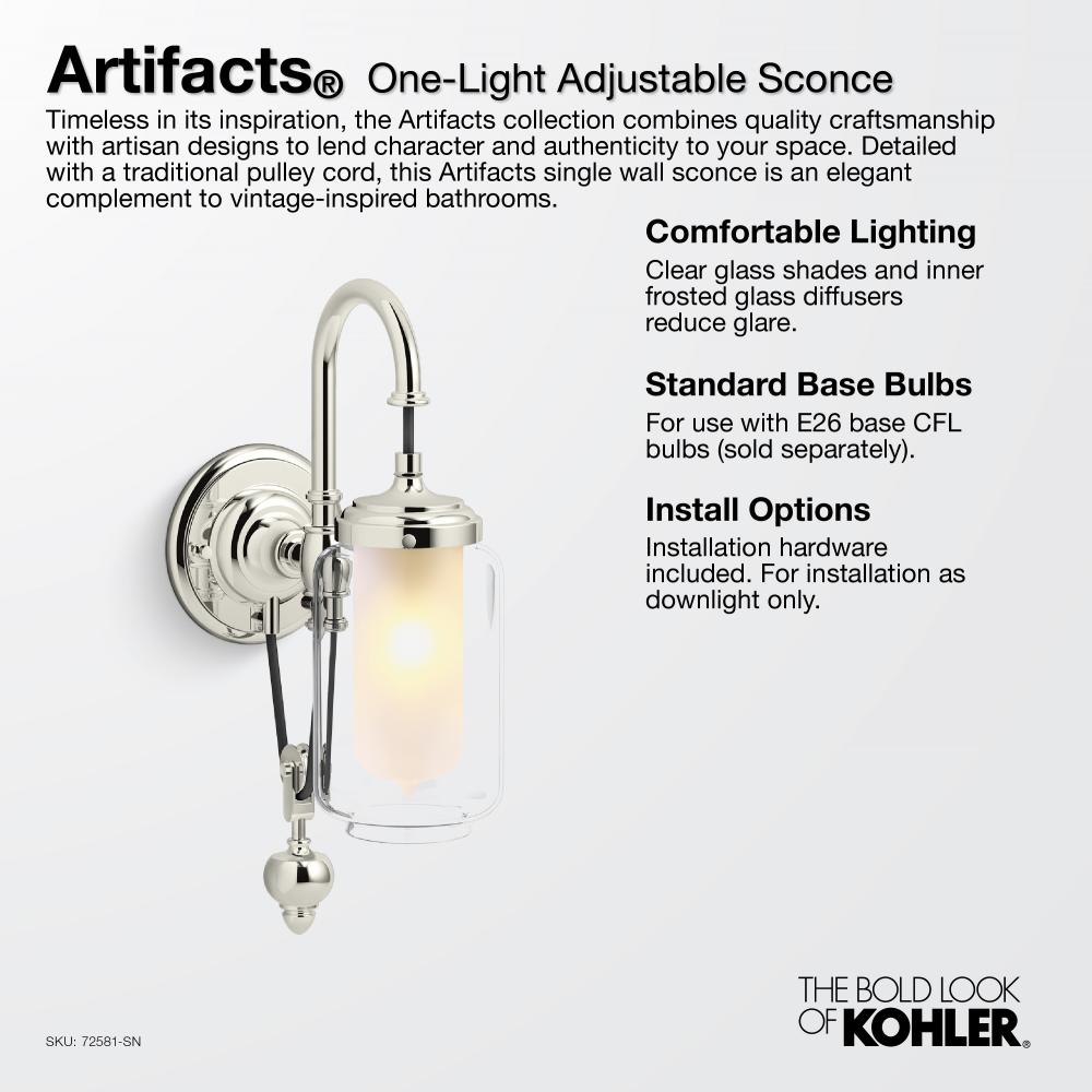 Timeless in its inspiration, the Artifacts collection combines quality craftsmanship with artisan designs to lend character and authenticity to your space. Detailed with a traditional pulley cord, this Artifacts single wall sconce is an elegant complement to vintage-inspired bathrooms.