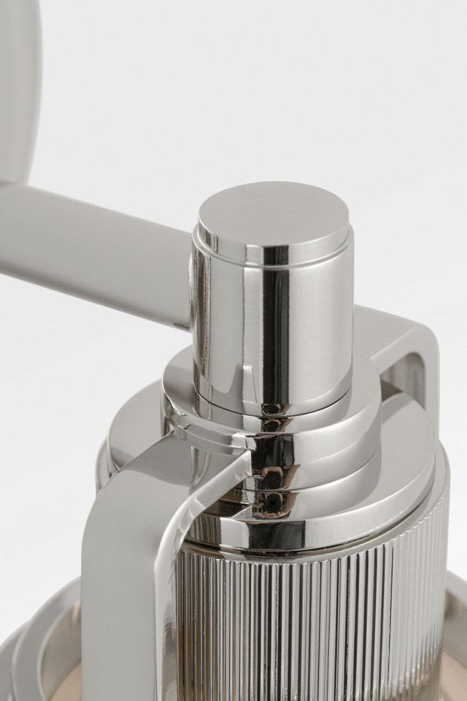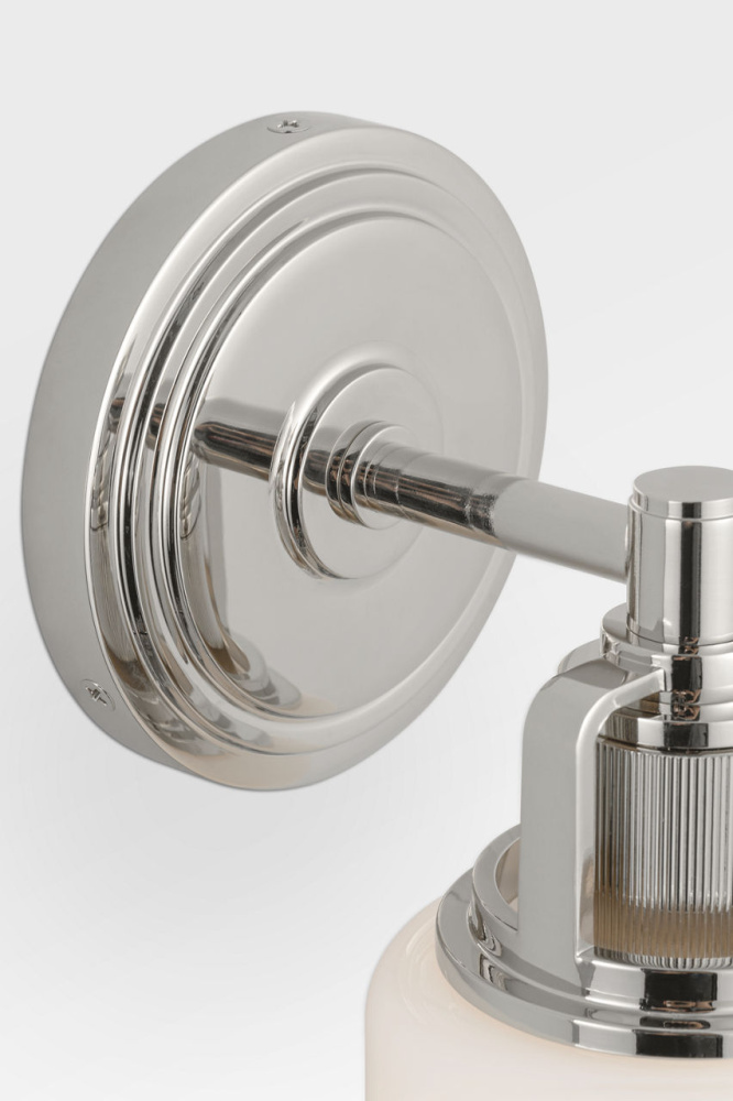 The Ashford 11" Vanity by Chapman & Myers brings refined industrial detailing to compact bath environments. Designed to coordinate With popular faucet and bath fittings, it features a square arch bracket and circular collar that supports a white cylindrical glass shade. The open collar allows light to shine upward, highlighting the vertically knurled socket cover—a subtle yet striking detail that adds texture and depth. With its smaller scale, the 11" fixture is ideal for powder rooms, guest bathrooms, or paired installations beside mirrors, where its tailored geometry and thoughtful craftsmanship offer a clean, versatile lighting solution.