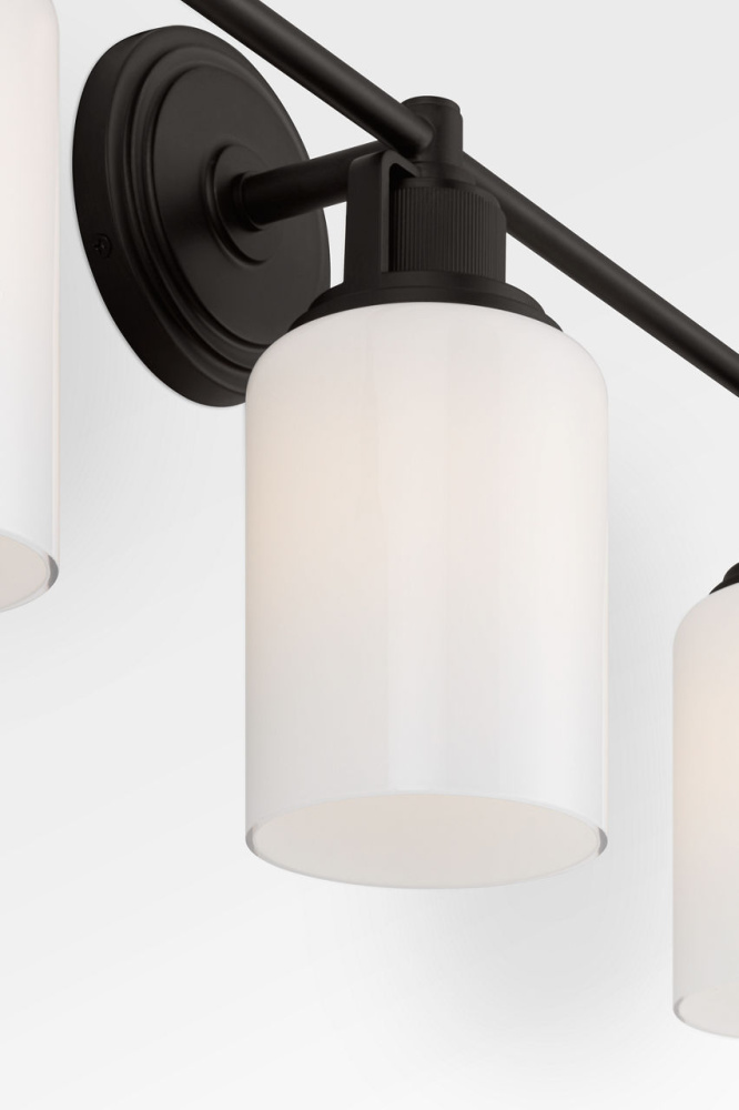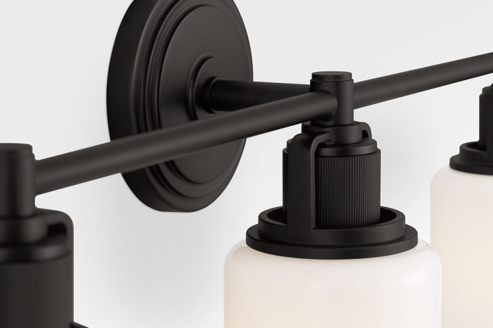 The Ashford 24" Vanity by Chapman & Myers is designed for larger bath environments, offering a generous scale and elevated detailing. Its square arch bracket and circular collar support dual white cylindrical glass shades, With open collars that allow light to highlight the vertically knurled socket covers—an intentional design element that echoes popular bath fittings. Ideal for primary bathrooms, double-sink vanities, or expansive layouts, the 24" fixture blends industrial precision With refined simplicity, making it a natural complement to both traditional and modern interiors.