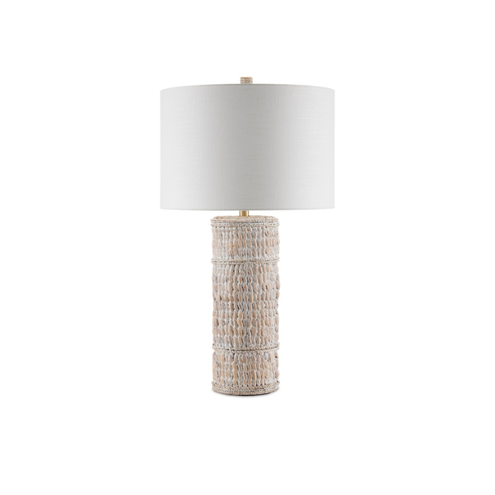 The Azores White Table Lamp has a body covered in woven water hyacinth that has a light white wash over the natural material. This is one of our sustainably inspired offerings because the plant grows naturally in Vietnam in the streams, and people harvest it to make baskets. Because it grows wild and voraciously, removing the plants keeps the streams from clogging. Design details of note are how the water hyacinth is woven in different directions and the matching finial.