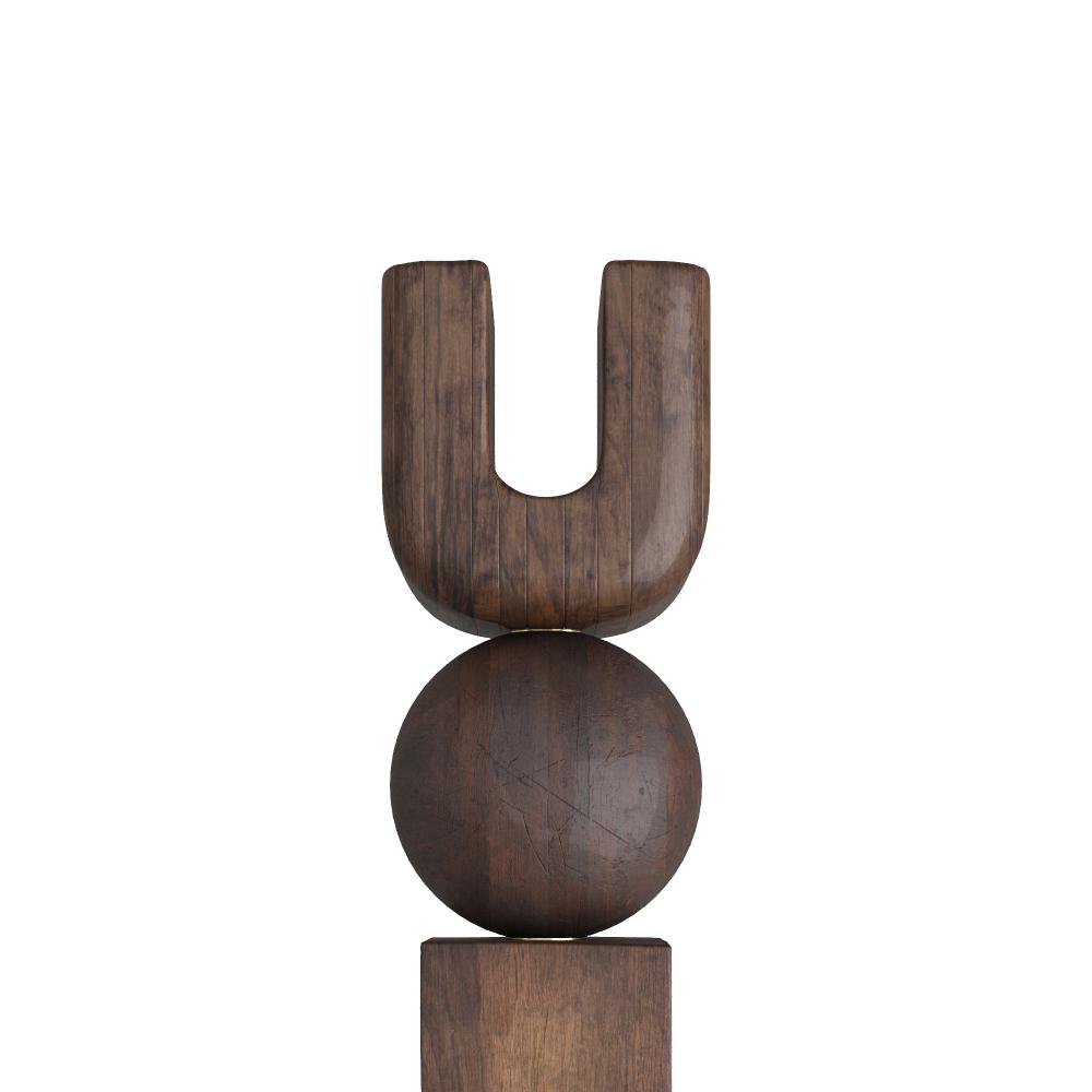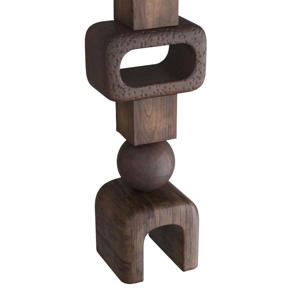 Crafted of mindi wood stained in walnut and umber, this modernist totem is inspired by Polynesian statuary. A vertical tower of rounded and square forms was designed to command any space. Made to sit on the floor. FInish will vary.