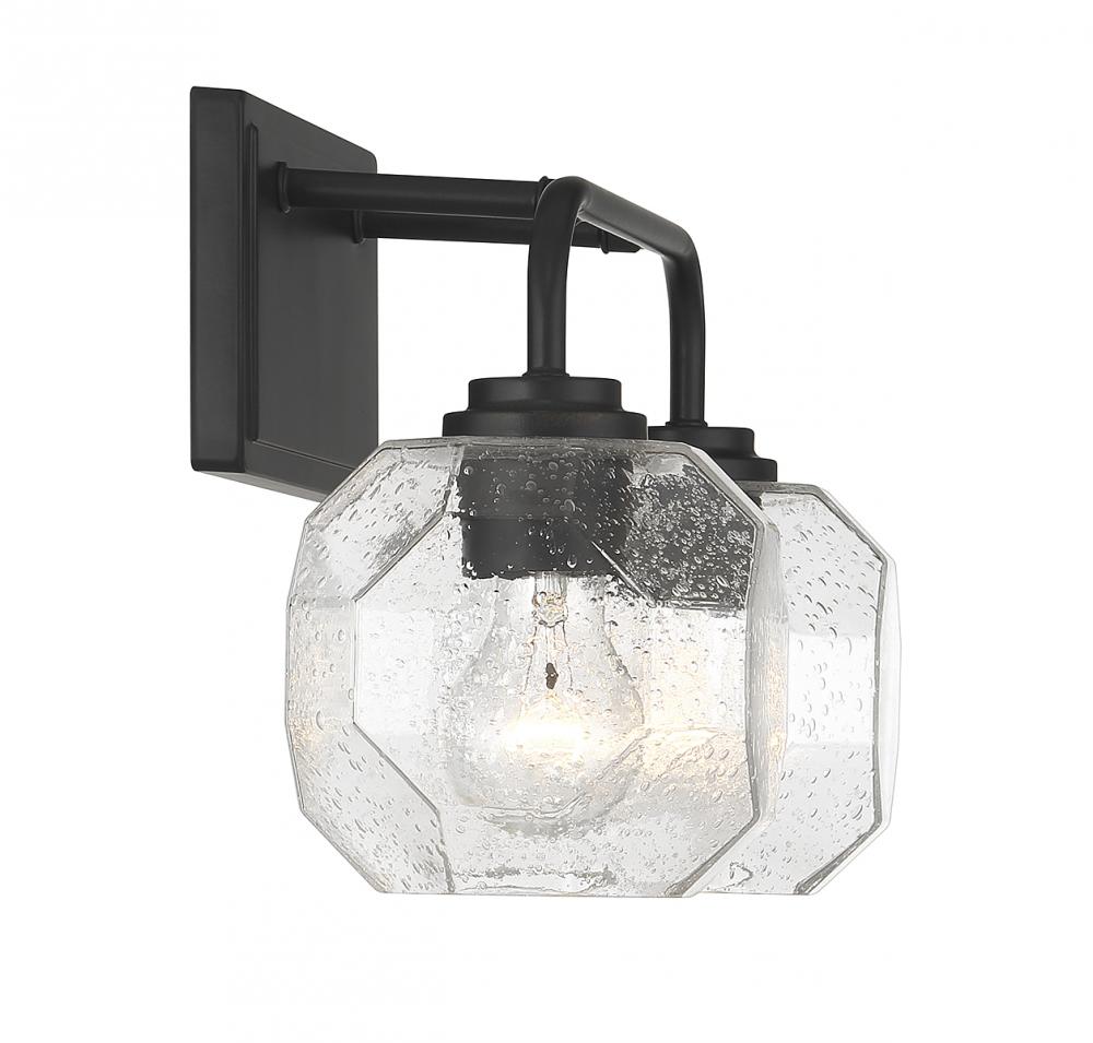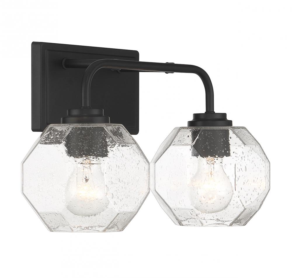 The Baldwin 2-light bath vanity light brings a unique geometric appeal to bathrooms with its clear seeded glass shades that are molded into octagonal facets. These bold shades take center stage and pair nicely with the matte black finish. Baldwin is 9.5" in height, 16" in width and extends 7.5" from the wall. It uses 2 standard size bulbs of up to 60 watts per bulb (bulbs not included).