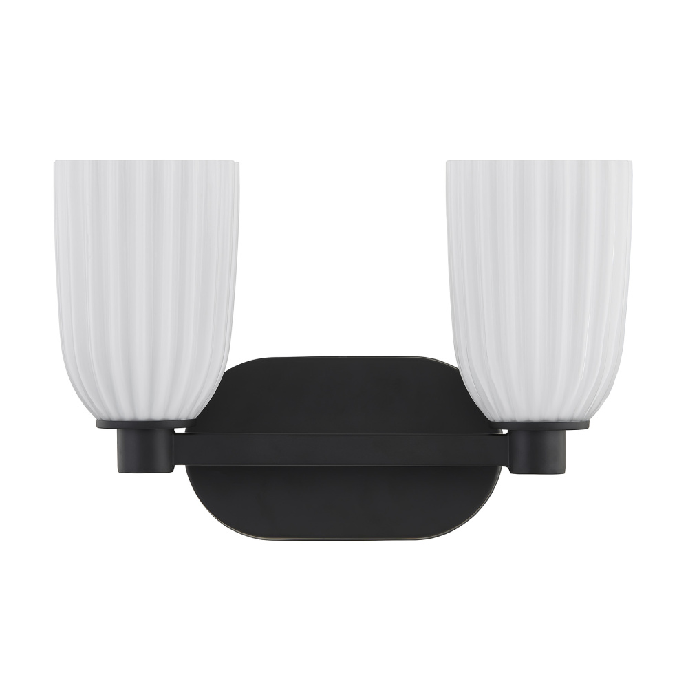 The Savoy House Baldwin 2-light bath vanity light adds crisp contrast and contemporary style. The Matte Black finish sets off the ribbed opal glass shades, giving the fixture a bold silhouette while keeping the look airy and understated. Baldwin is 9.13" in height, 14" in width and extends 5.5" from the wall. It uses two standard size bulbs of up to 60 watts per bulb. Bulbs not included. Damp area rated and can be installed horizontally or vertically.