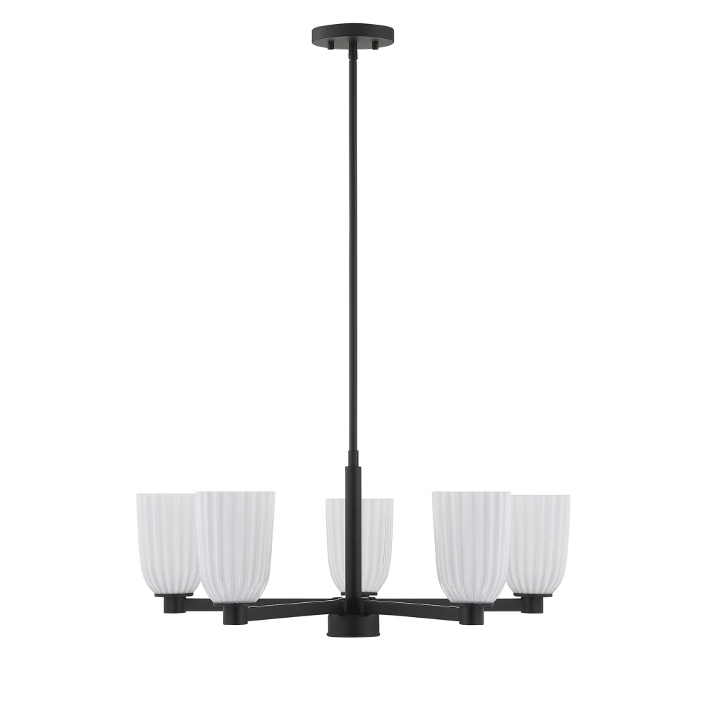 Make a confident design statement with the Savoy House Baldwin 5-light chandelier. Its Matte Black finish gives the minimalist frame a bold presence while ribbed opal glass shades soften the light for a warm, welcoming glow. Baldwin is 11.5" in height and 28" in width. It uses five standard size bulbs of up to 60 watts per bulb. Bulbs not included. Includes four 12" downrods and one 6" downrod.