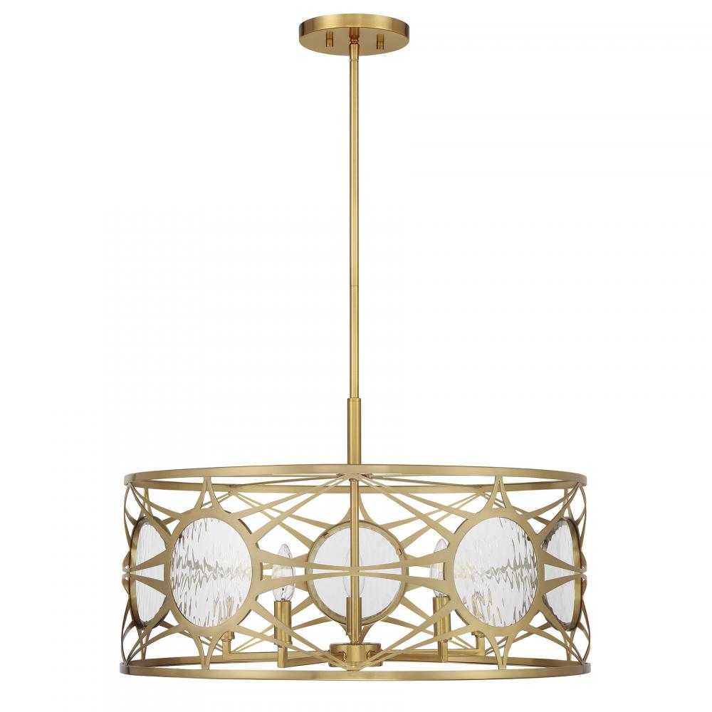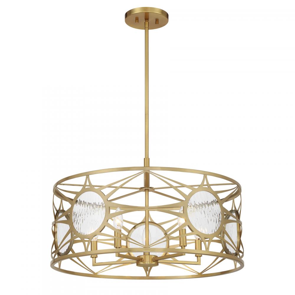 Let your sense of style shine through with the beautiful Balfour 5-light pendant from Savoy House! Its drum-shaped structure wears a Warm Brass finish and is decorated with eye-catching starburst patterns that hold circular panes of clear water glass. Balfour is 24" in width and has an adjustable height ranging from 14" to 68". It uses five candelabra size bulbs of up to 60 watts per bulb. Bulbs not included. Comes with four 12" downrods and one 6" downrod. Can be converted for use as a ceiling semi-flush mount light.