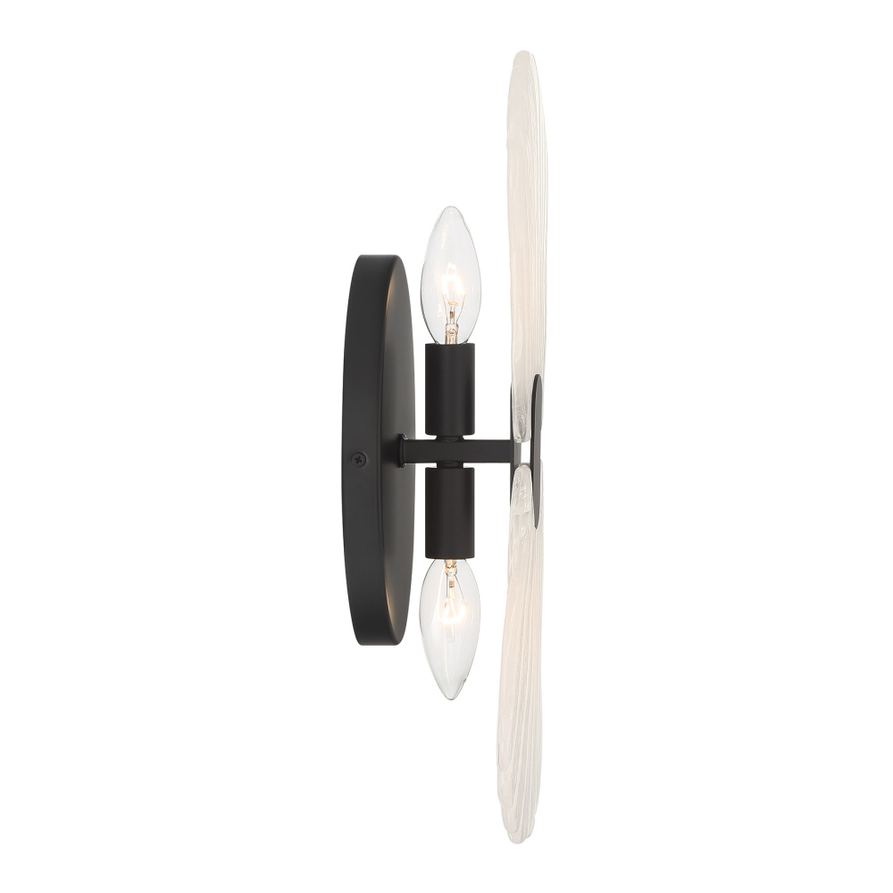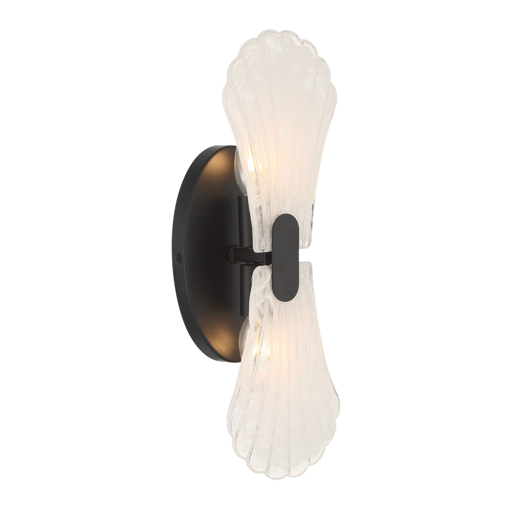 In the Bancroft 2-light sconce from Savoy House, coastal charm is given a stylish upgrade! Its design is finished in bold Matte Black and decorated with shell shapes crafted from mesmerizing strie glass. Bancroft is 16" in height, 5.5" in width and extends 3.5" from the wall. It uses two candelabra size bulbs of up to 60 watts per bulb. Bulbs not included.