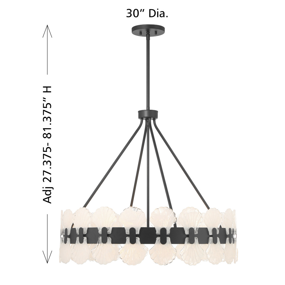 In the Bancroft 6-light chandelier from Savoy House, coastal charm is given a stylish upgrade! Its design is finished in bold Matte Black and decorated with shell shapes crafted from mesmerizing strie glass. Bancroft is 27.375" in height and 30" in width. It uses six candelabra size bulbs of up to 60 watts per bulb. Bulbs not included. Comes with four 12" downrods and one 6" downrod.
