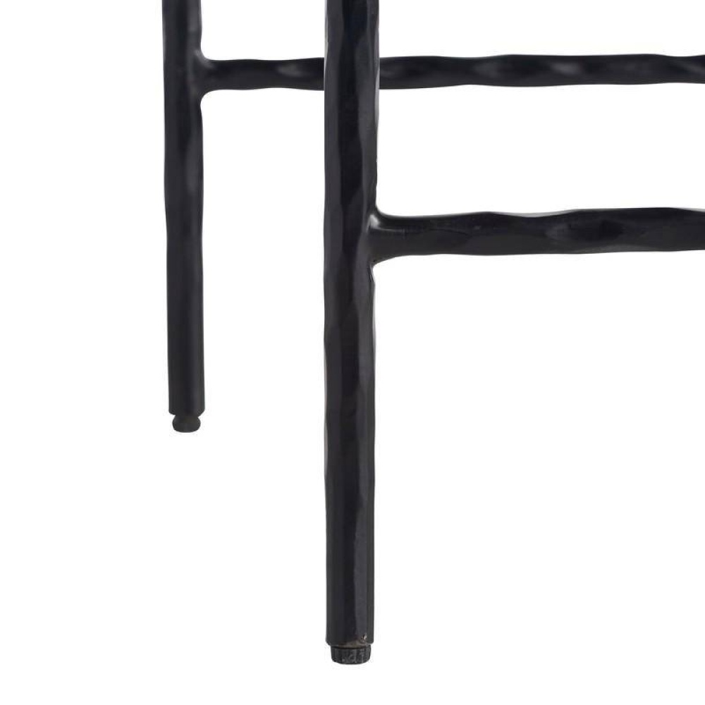 This exquisite counter stool is perfectly poised, perched on delicate legs recalling an insect. A body of natural iron is hand-forged to yield soft impressions along its sharp-angled frame. The tight seat and bolster back are covered in performance fabric in Oxford white. Finish will vary.