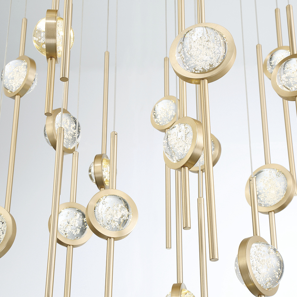 Various sized anodized rods suspend vertically in black or gold finishes. Each rod is furnished with a clear seeded glass orb that perfectly sits within an anodized ring.