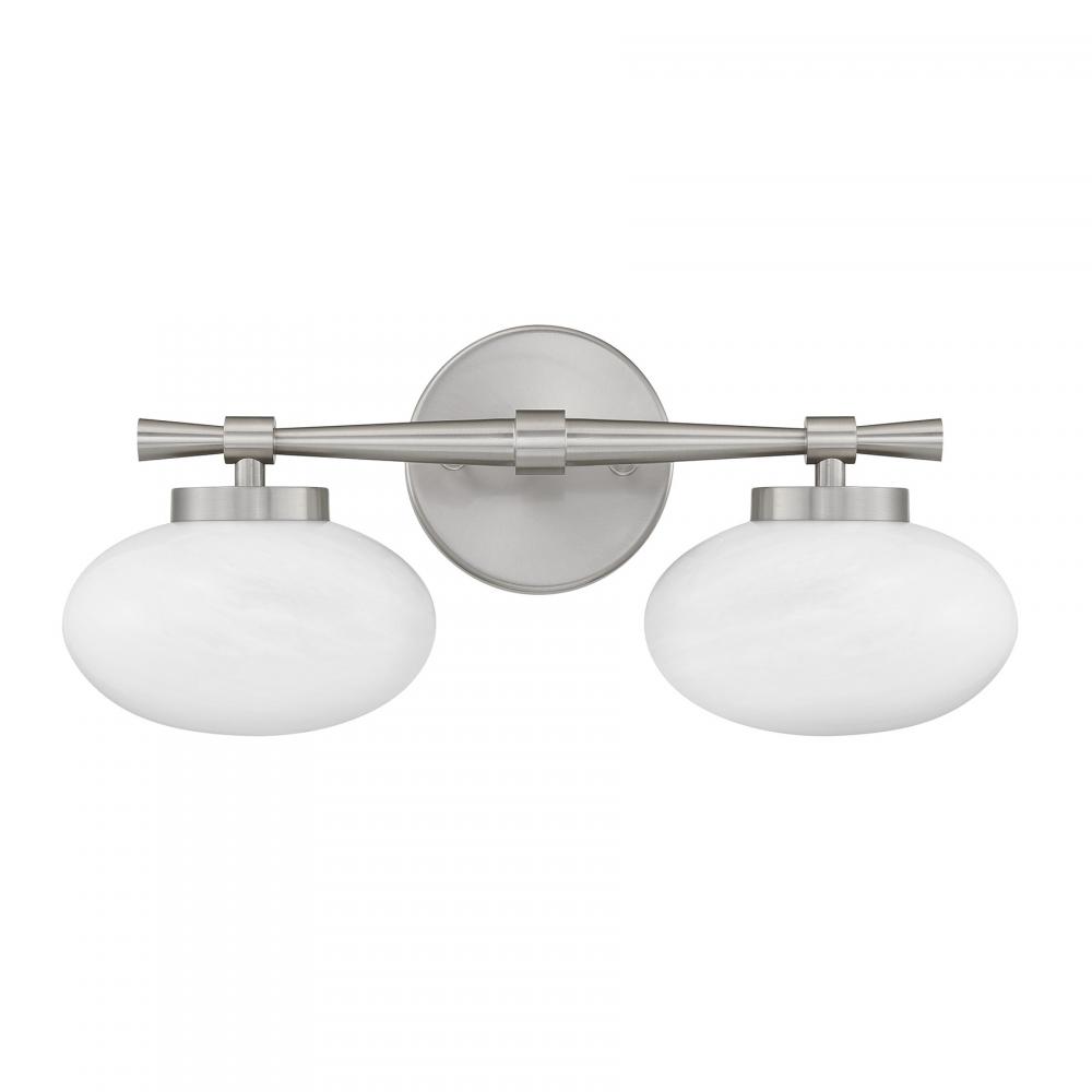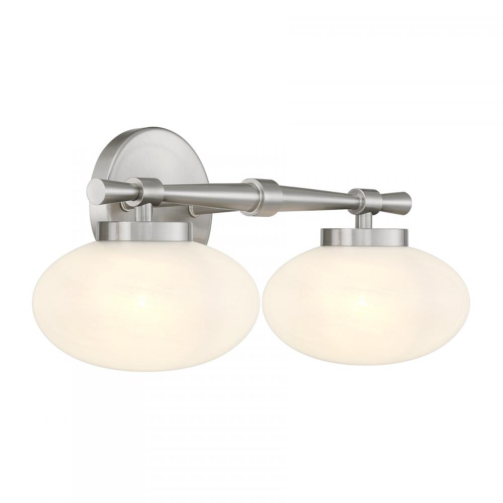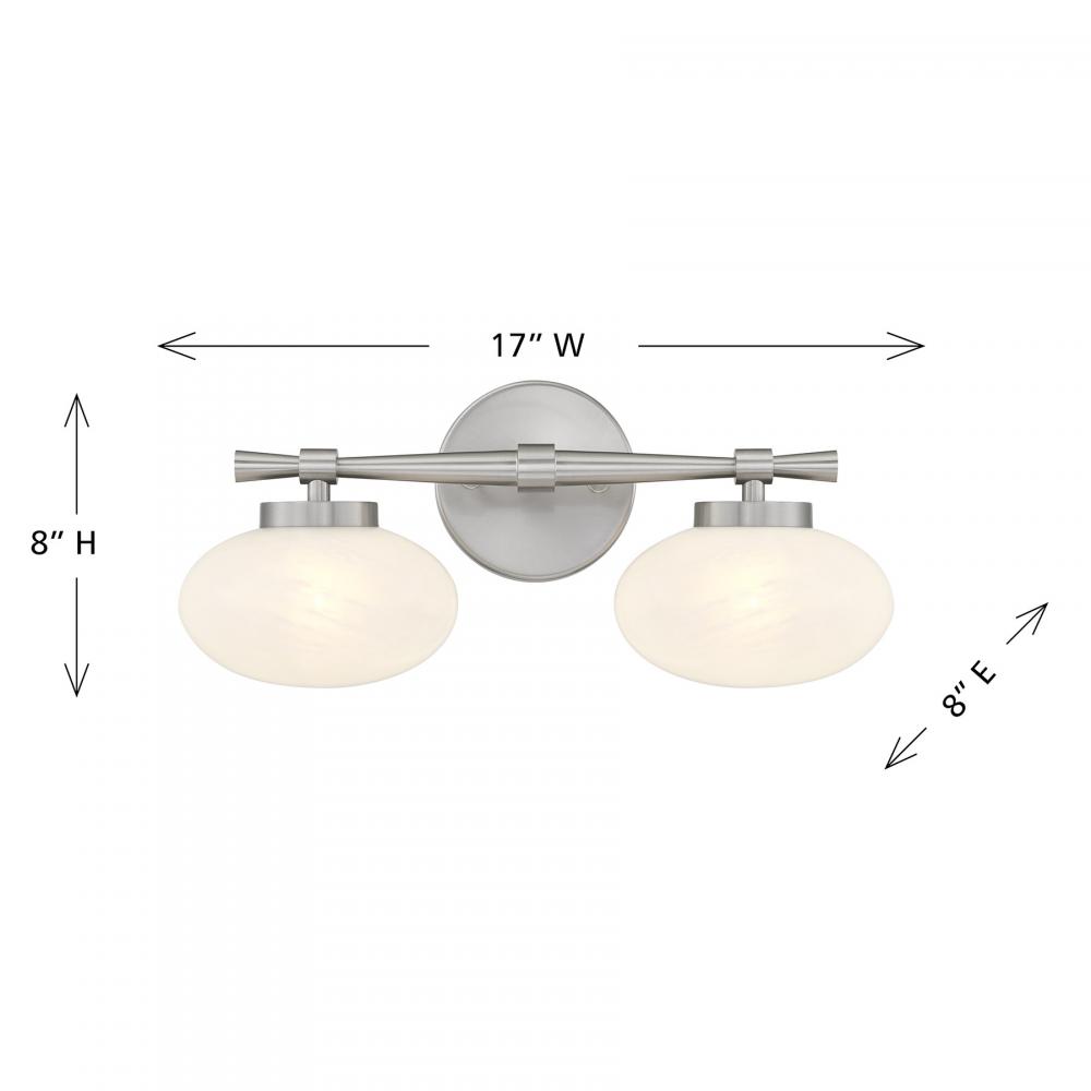 Add a hint of midcentury modern style to your bath with the Savoy House Barrow 2-light bath light. Oval-shaped shades of swirling, stunning strie glass hang down from stylized arms that are, like the round backplate, finished in Satin Nickel. Barrow is 8" in height, 17" in width and extends 8" from the wall. It uses two G9 bulbs of up to 60 watts per bulb. Bulbs not included. Install as shown. This bath bar is damp area rated.