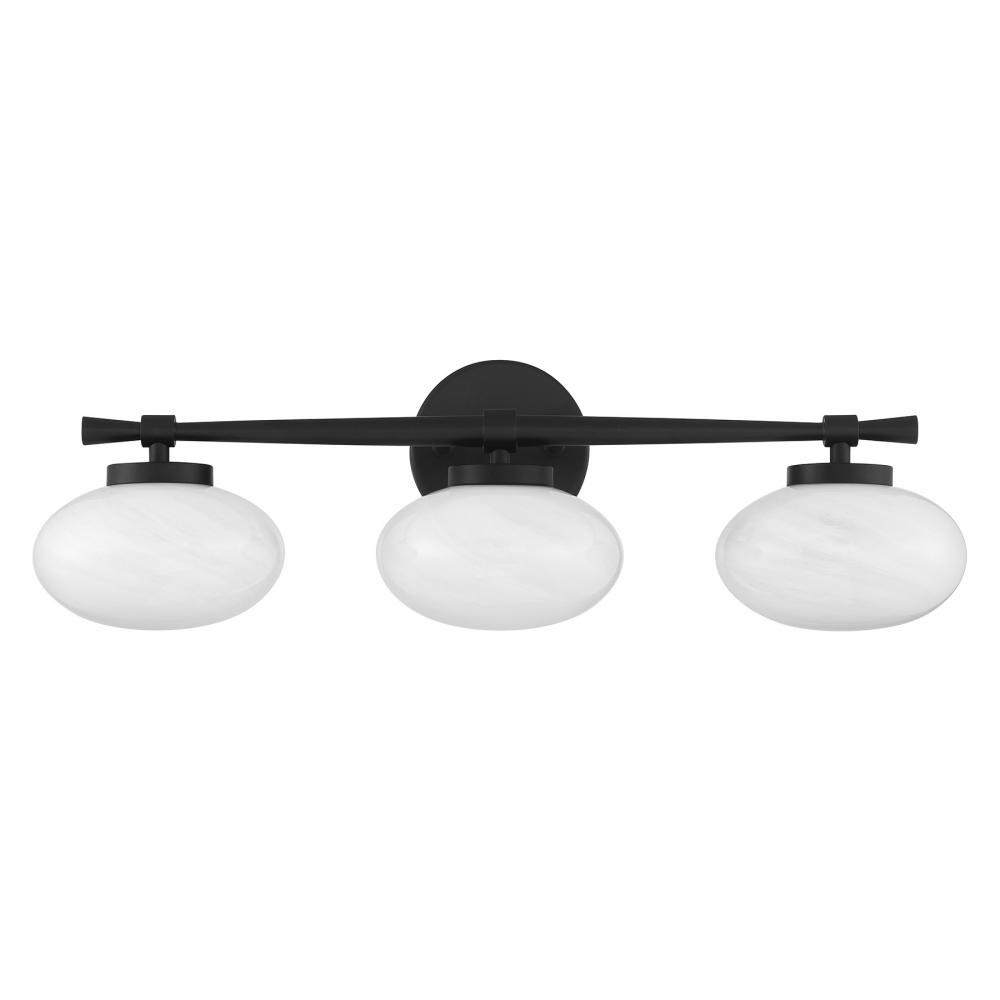 Add a hint of midcentury modern style to your bath with the Savoy House Barrow 3-light bath light. Oval-shaped shades of swirling, stunning strie glass hang down from stylized arms that are, like the round backplate, finished in Black. Barrow is 8" in height, 25" in width and extends 8" from the wall. It uses three G9 bulbs of up to 60 watts per bulb. Bulbs not included. Install as shown. This bath bar is damp area rated.