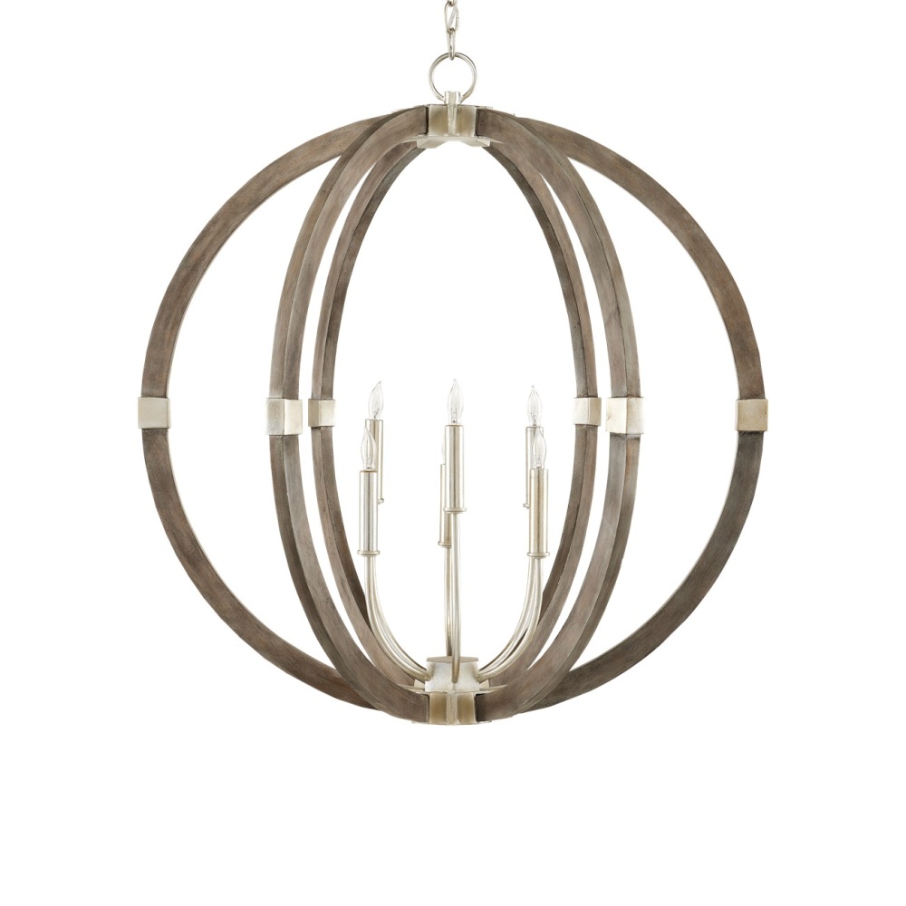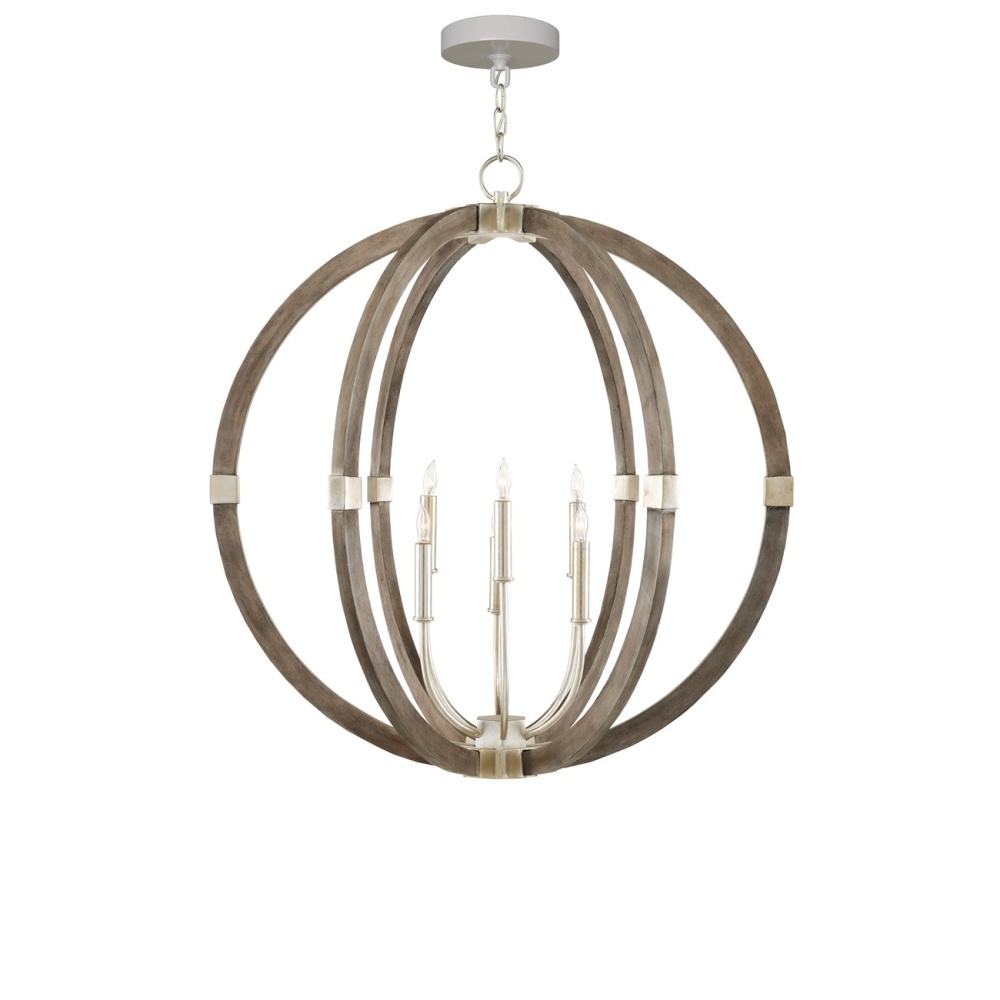 The Arts & Crafts movement inspired the design of the Bastian Orb Chandelier, which is made of wrought iron in a contemporary silver leaf finish and wood in a chateau gray finish. The crisp feel of the silver metal clasping the spokes of wood brings extra sophistication to this gray chandelier. There are a number of designs in this family of fixtures. Adjustable from 37.5" to 106" with use of included chain/rod kit/cable. If your space calls for a longer drop, additional chain/rods/cable is available for purchase.