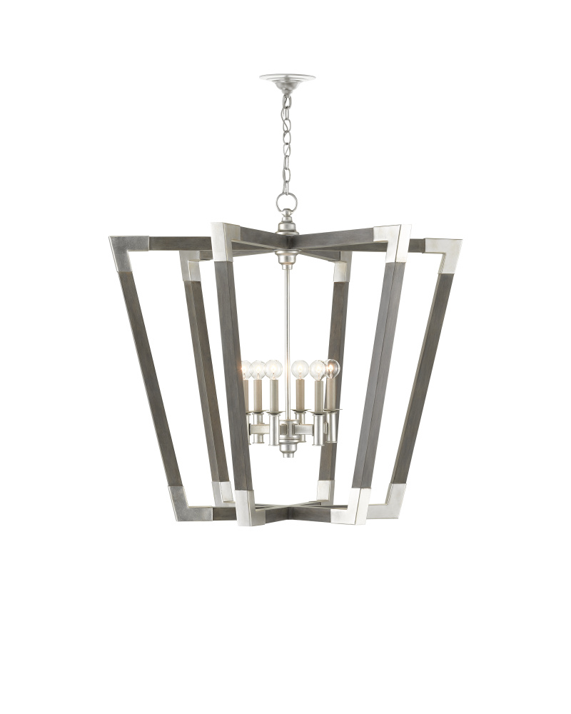 The Arts & Crafts movement inspired the design of the Bastian Large Gray Chandelier, which is made of wrought iron and wood in chateau gray and contemporary silver leaf finishes. The crisp feel of the silver metal clasping the spokes of wood brings extra sophistication to this lantern-shaped chandelier. There are a number of designs in this family of fixtures. Adjustable from 41" to 109" with use of included chain/rod kit/cable. If your space calls for a longer drop, additional chain/rods/cable is available for purchase.