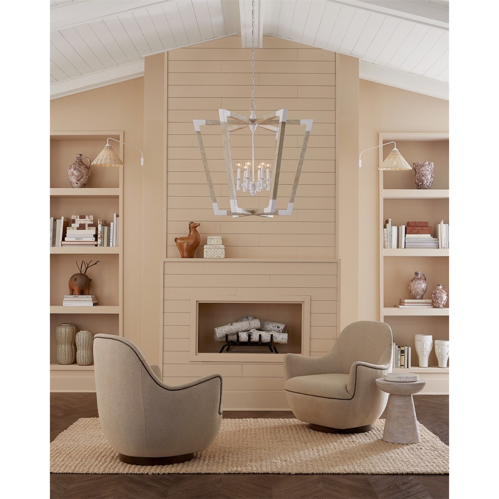 The Arts & Crafts movement inspired the design of the Bastian Large Sandstone Lantern, which is made of wrought iron and wood in sugar white and sandstone finishes. The crisp feel of the white metal clasping the spokes of washed wood brings extra sophistication to this lantern-shaped chandelier. Adjustable from 41" to 109" with use of included chain/rod kit/cable. If your space calls for a longer drop, additional chain/rods/cable is available for purchase.