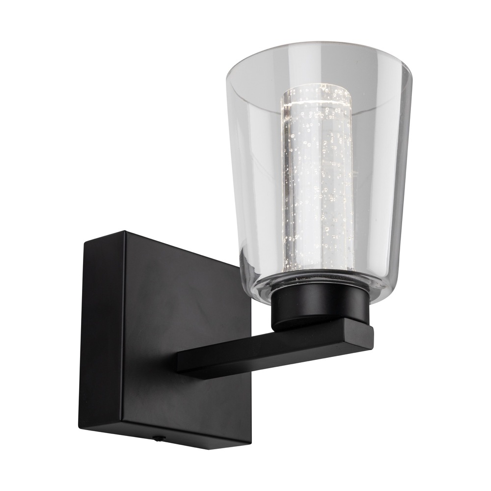 The Dalton Collection features a distinctive design with a clear outer glass surrounding a interior seeded cylinder glass, creating a unique and modern aesthetic. The LED lighting is skillfully integrated to accentuate the seeded glass, providing a visually striking and exceptional effect. Show in with a black frame (also available in chrome). Additionally, these models have a built-in LED switch, allowing users to effortlessly adjust the color temperature from 3000, 4000, and 5000 kelvin for a customizable lighting experience. This collection seamlessly combines functionality with an eye-catching design, making it an elegant choice for any bathroom space. Single wall sconce shown. (Also available in a 3 and 4 light versions.)