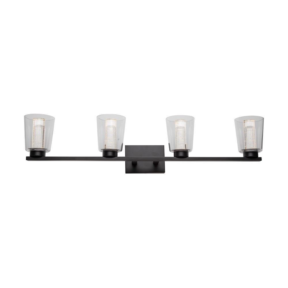 The Dalton Collection features a distinctive design with a clear outer glass surrounding a interior seeded cylinder glass, creating a unique and modern aesthetic. The LED lighting is skillfully integrated to accentuate the seeded glass, providing a visually striking and exceptional effect. Show in with a black frame (also available in chrome). Additionally, these models have a built-in LED switch, allowing users to effortlessly adjust the color temperature from 3000, 4000, and 5000 kelvin for a customizable lighting experience. This collection seamlessly combines functionality with an eye-catching design, making it an elegant choice for any bathroom space. 4 light wall sconce shown. (Also available in a single and 3 light versions.)