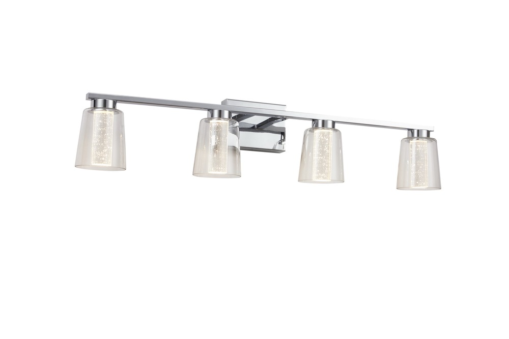 The Dalton Collection features a distinctive design with a clear outer glass surrounding a interior seeded cylinder glass, creating a unique and modern aesthetic. The LED lighting is skillfully integrated to accentuate the seeded glass, providing a visually striking and exceptional effect. Show in with a chrome frame (also available in black). Additionally, these models have a built-in LED switch, allowing users to effortlessly adjust the color temperature from 3000, 4000, and 5000 kelvin for a customizable lighting experience. This collection seamlessly combines functionality with an eye-catching design, making it an elegant choice for any bathroom space. 4 light wall sconce shown. (Also available in a single and 3 light versions.)
