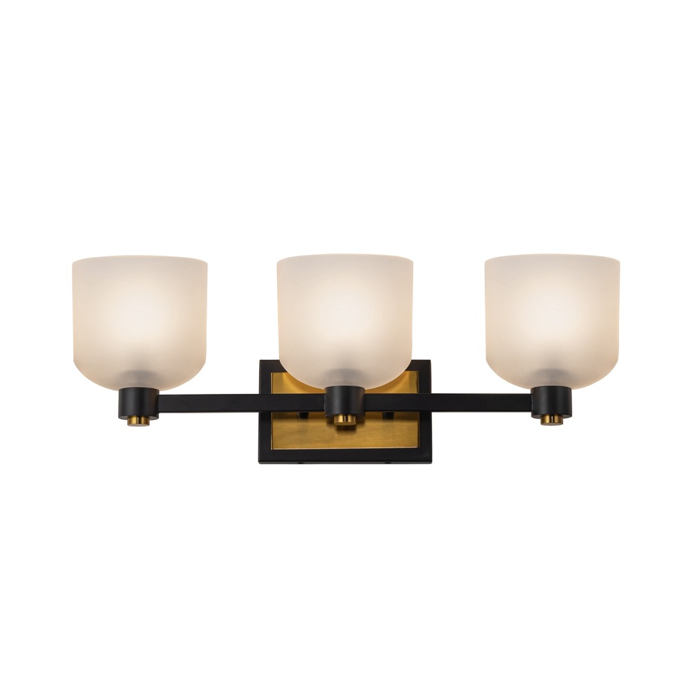 The Lyndon vanity collection easily combines modern elegance with timeless design. This collection features oval shaped acid white glassware delicately set upon a black frame with brushed brass accents. The brushed brass accents accentuate the collection, adding a touch of warmth. A very stylish look for any bathroom space. From the Lighting Pulse design firm. 3 light wall sconce shown (available in a single and 4 light models)