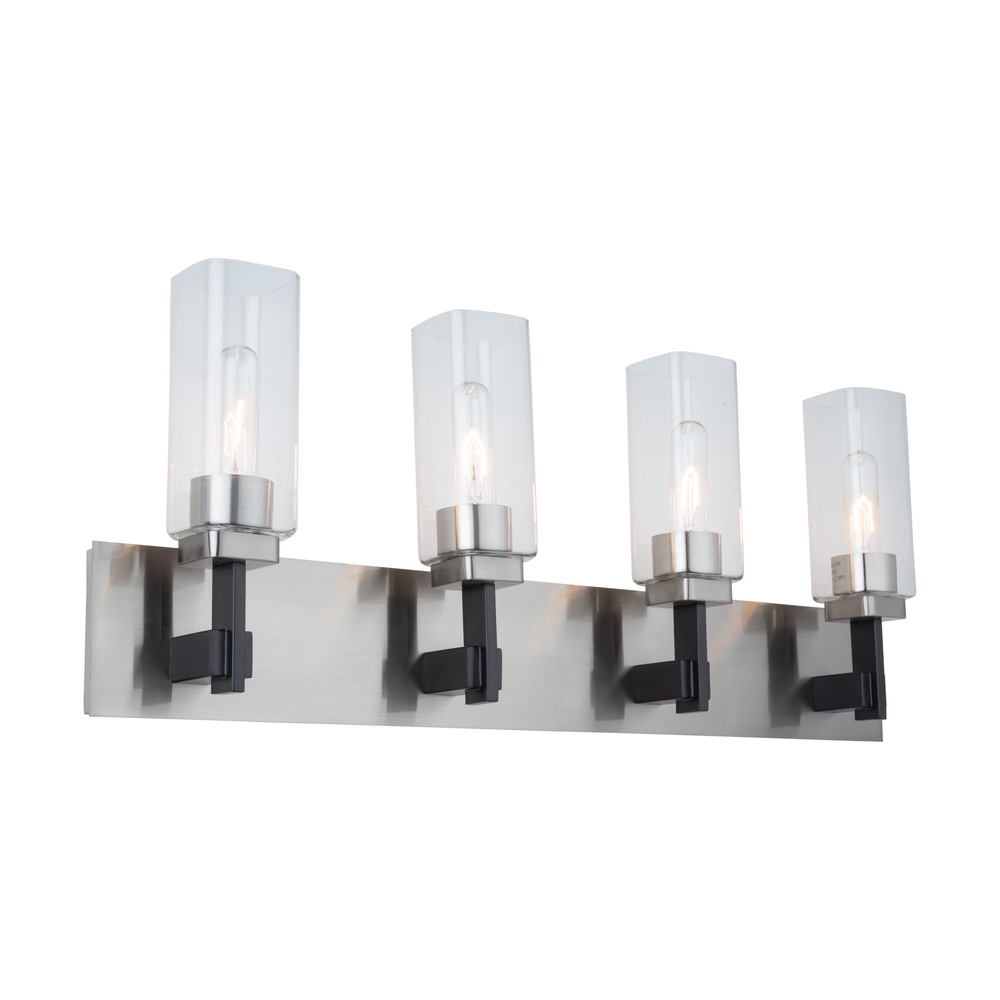 The Arlington collection features clear rectangular glassware that adds a touch of refinement to any bathroom and/or vanity. Its dual-tone black and satin nickel frame provides a modern aesthetic. This collection seamlessly blends style and functionality, making it a stylish choice for those seeking a contemporary and refined bathroom decor. 4 light wall sconce shown. (Also available in a single and 3 light versions.)