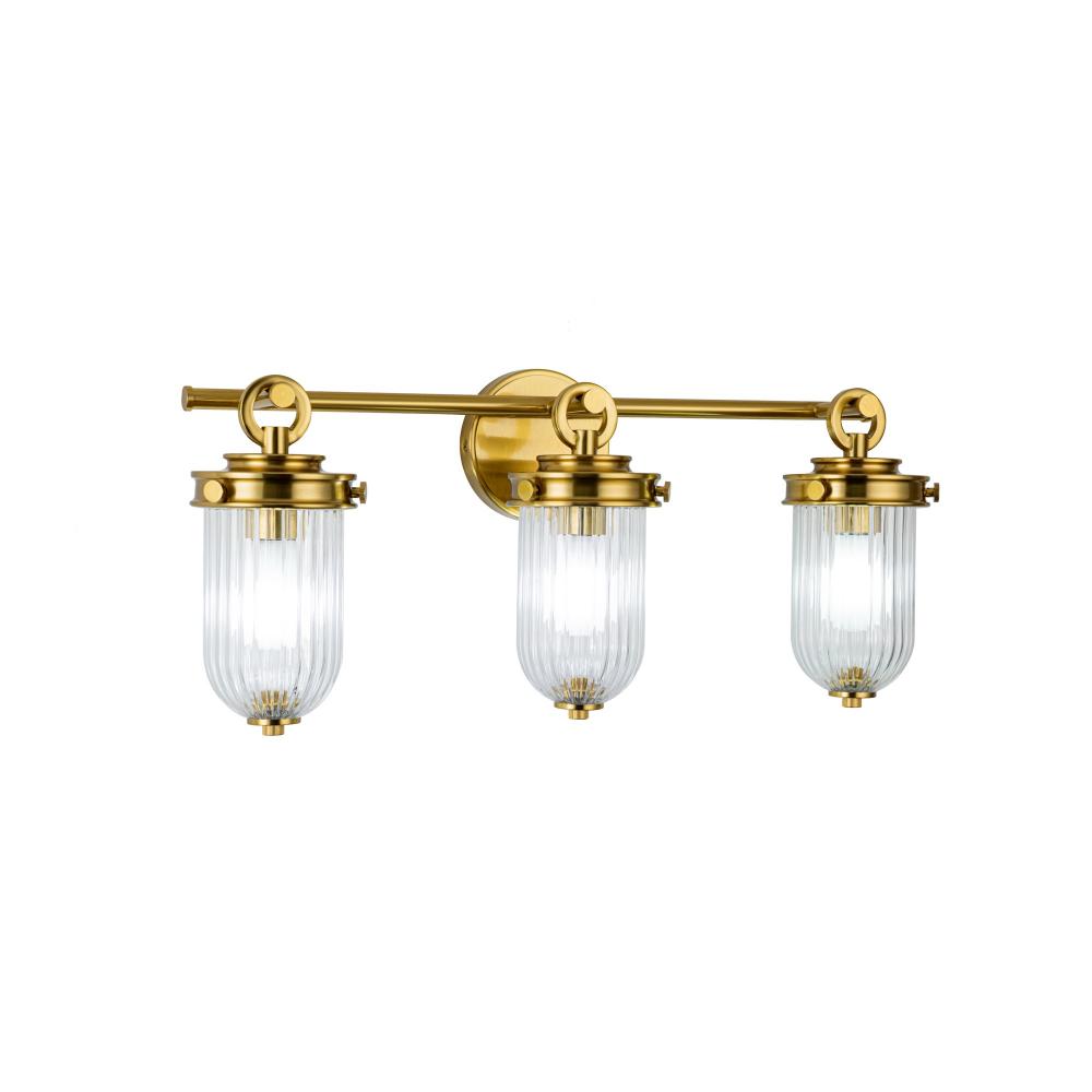 The Myla Collection 3 light wall sconce by Kevin Kraemer is a captivating blend of vintage charm and refined elegance, featuring a radiant brass frame that beautifully complements its clear ribbed glassware. The timeless design creates a warm and inviting glow, making it a stunning centerpiece in any setting. Perfectly crafted for those who appreciate classic sophistication with a modern touch. Great for any bathroom setting.