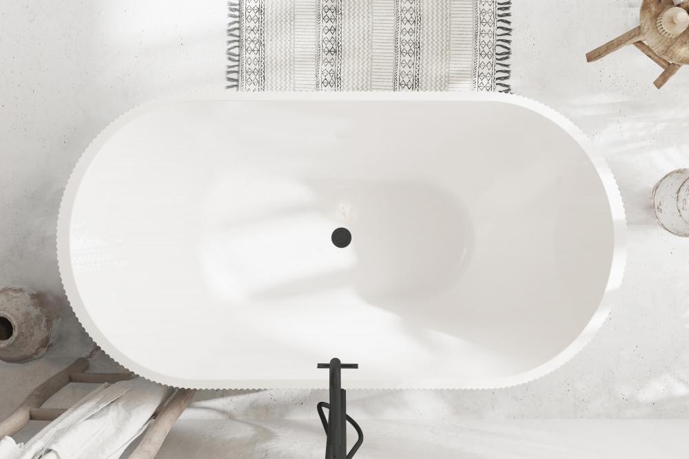 Elevate your bathroom’s aesthetic with this stunning freestanding soaking bathtub, featuring a vertical fluted exterior design that adds texture and sophistication to any space.