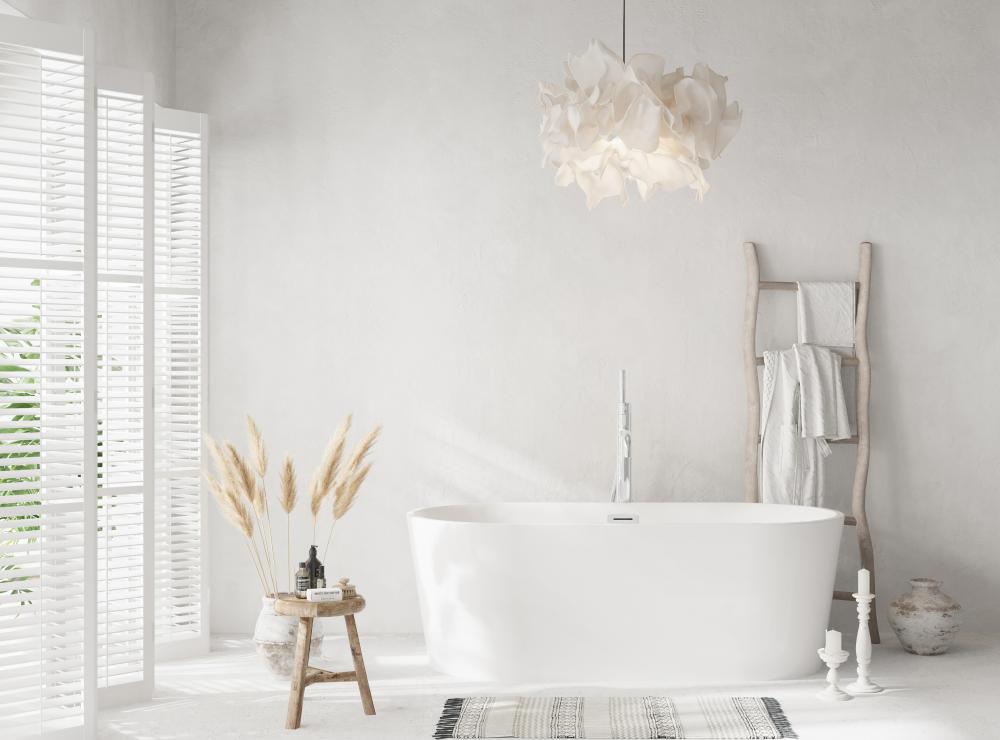 A double-ended freestanding bathtub offers symmetry and luxury. Both ends are gently sloped, allowing for comfortable reclining from either side.