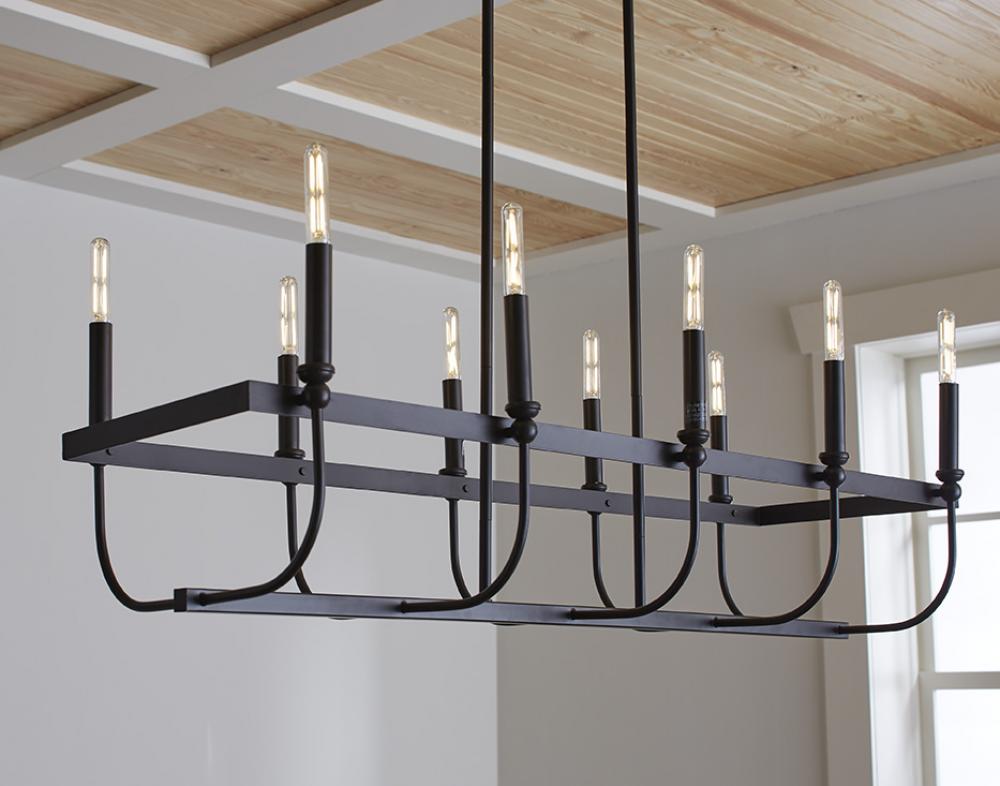 The Beckett island light features a simple design in a county-industrial style. It can be dressed up or down depending on the type of light bulbs used. This charming fixture is available in a popular matte black finish.
