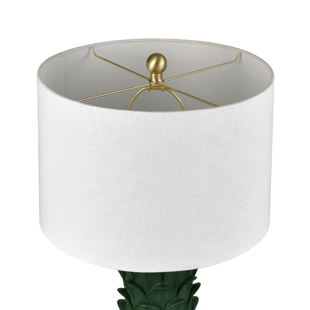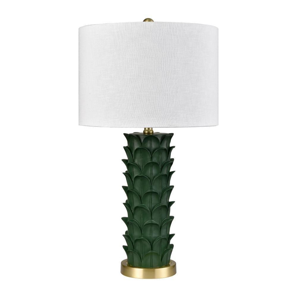 The Beckwith Table Lamp features a tall cylindrical body in a painted finish made from sculpted composite with a stacked leaf pattern, with rows of opening leaves traveling up the base. The lamp is topped with a white fabric drum shade.