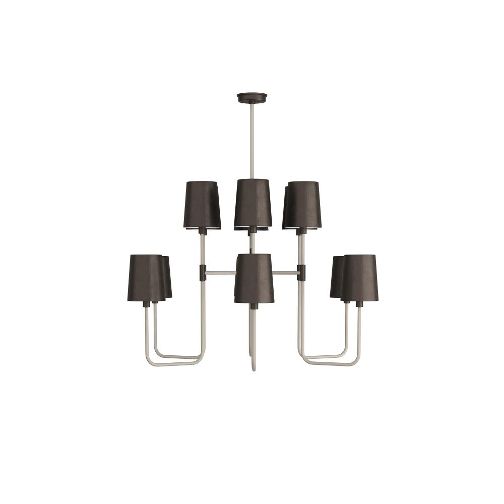 A classic chandelier gets an industrial twist with the contemporary Bedford. Finished with exaggerated arms in a smoke toned powder-coat and bronzed steel shades, it adds a masculine allure to any dining or living room. Made to illuminate the largest of spaces. Damp-rated, although limited covered outdoor conditions may affect finish.