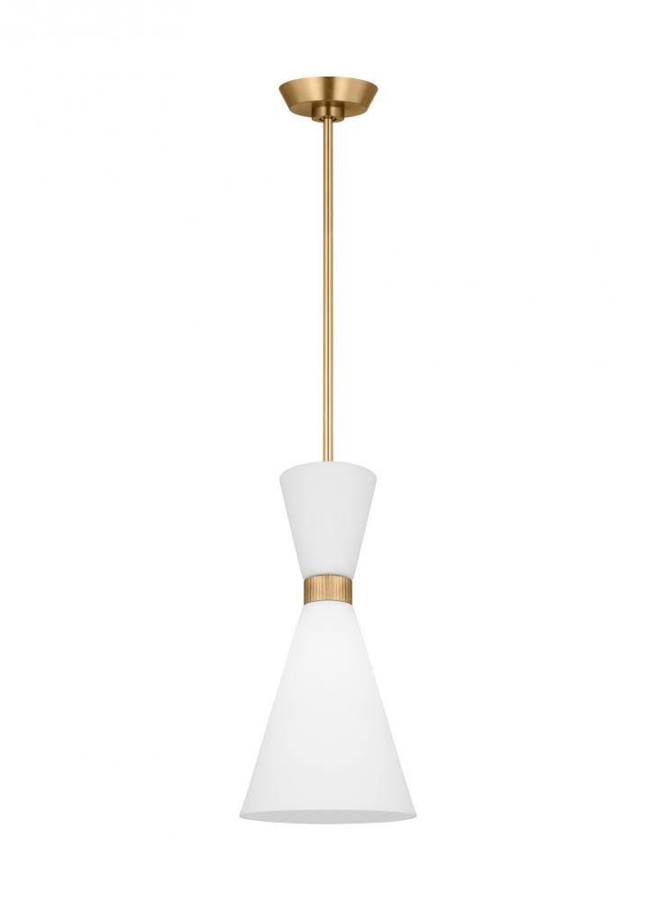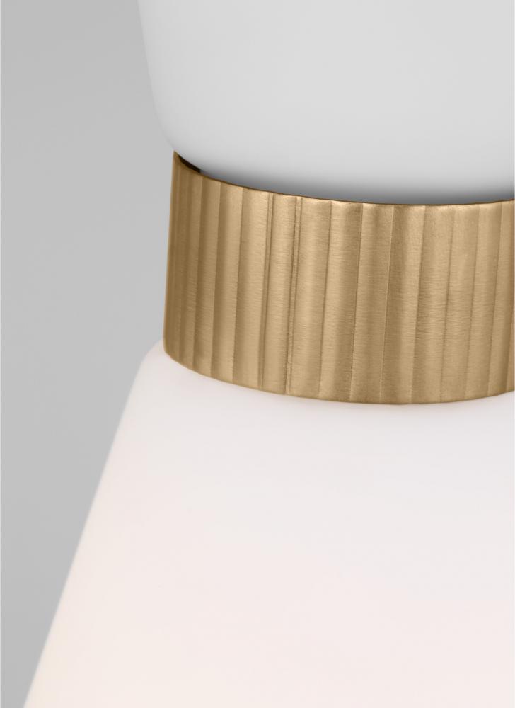 Inspired by playful mid-century modern design, the Drew & Jonathan Belcarra Small Pendant is accentuated by a flared glass shade with ribbed metal details and etched white glass that bestows an almost whimsical touch to the clean design. Available in three finishes, Brushed Steel, Midnight Black, and Satin Brass, the Belcarra looks great on its own or when grouped in multiples. This product may be mounted on a sloped ceiling and is cETL listed for damp locations, making it the perfect lighting solution for any space.