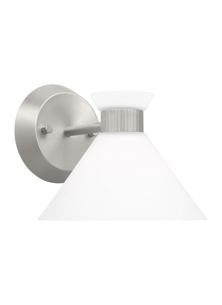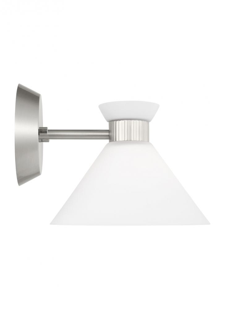The flared glass shade with ribbed metal details and etched white glass of this light bring clean lines and classic mid-century modern design to any wall or bath space