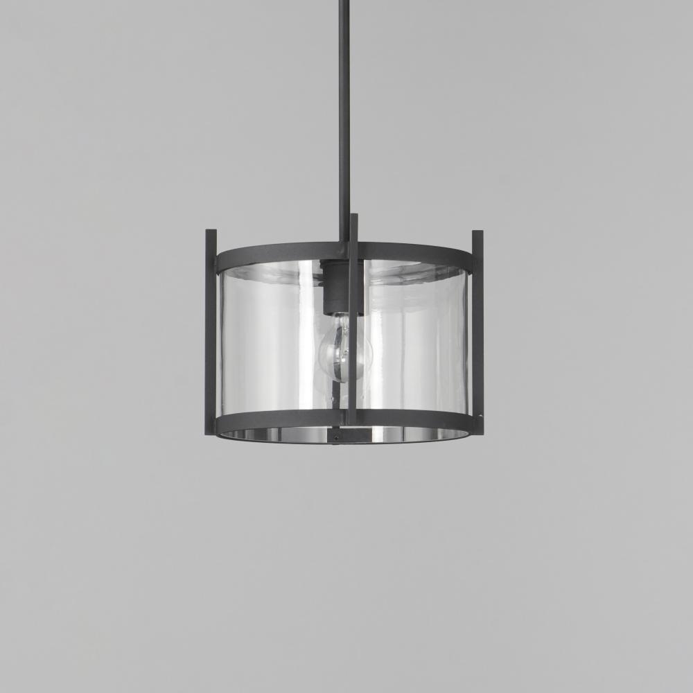 Squared columns in Matte Black finish tower above the cylindrical glass shade rated for outdoor applications. Available in a more modern clear glass option or hammered glass. A rectangular hook detail carries the square form through to the backplate. A mod