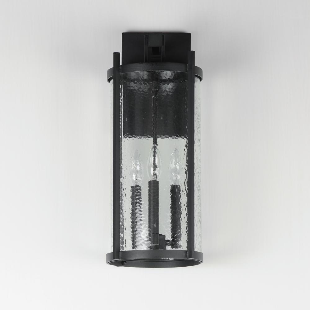 Squared columns in Matte Black finish tower above the cylindrical glass shade rated for outdoor applications. Available in a more modern clear glass option or hammered glass. A rectangular hook detail carries the square form through to the backplate. A mod