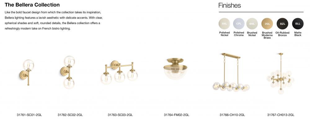 Distinguished by elegant, jewelry-inspired silhouettes, the Bellera lighting collection adds style and grace to the home with sconces, pendants, chandeliers, and flush-mounts. Featuring clear glass globes, flared metal rods and bases, and intricate metal detailing, Bellera fixtures deliver versatility with a transitional style that easily flows with your entire home's aesthetic. Brilliant and functional, these pieces were created to complement the KOHLER Bellera faucet collection.