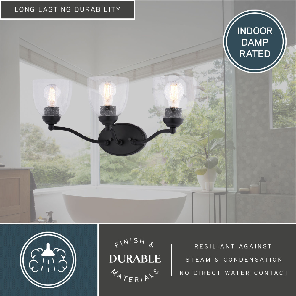 Transform your bathroom's ambiance with the Bellwood 3-light vanity, a perfect blend of classic design and modern sophistication. The matte black finish provides a timeless feel, while the clear seeded glass shades add a touch of vintage charm, diffusing a warm, inviting light. This wall light reimagines traditional style with thoughtfully updated details, including classic sphere accents and graceful tulip glass shades. Damp-rated for lasting performance, the Bellwood vanity is designed to withstand the moisture of bathroom environments. Enhance your daily routine with a fixture that seamlessly bridges traditional charm and modern functionality.
