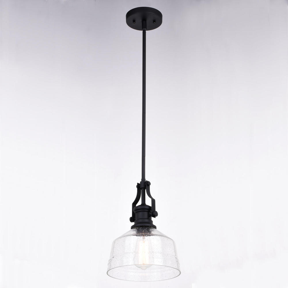 The Beloit mini-pendant adds a welcoming and inviting feel to your kitchen or living spaces. Soft curving lines finished in matte black, are paired with a large clear seeded glass shade, creating a look that accents the most comfortable spaces. Combine that with a vintage Edison style filament bulb to complete the look. Bring a level of sophistication to your trendy farmhouse or urban style with this mini pendant.