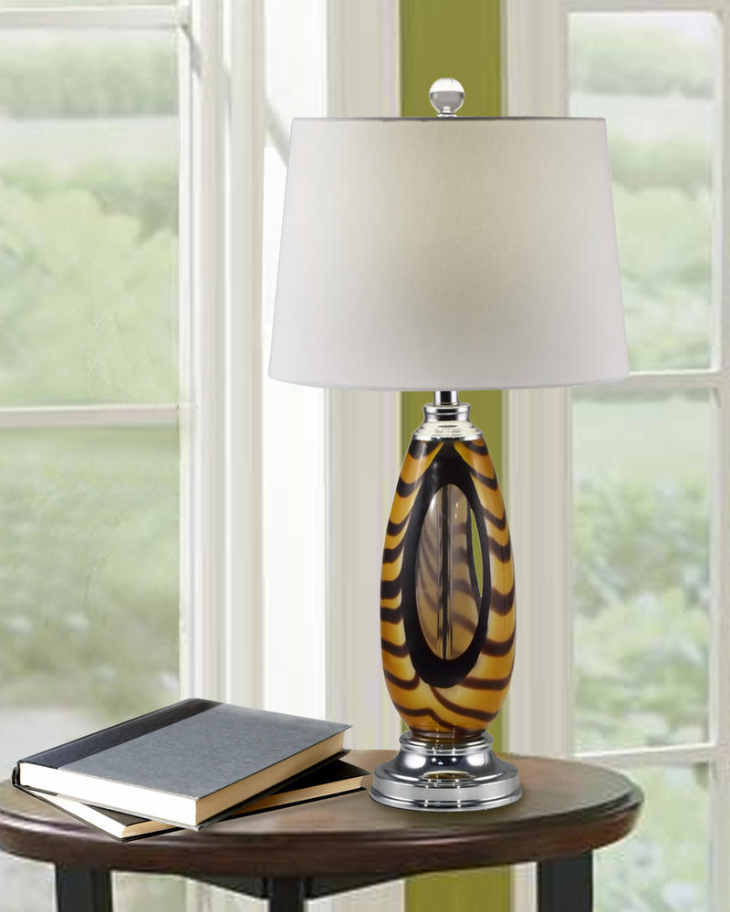 The Bengal Tiger Art Glass Table Lamp will fashionably complement any decor in your home or office. The lamp features a brilliant hand blown art glass and metal base. The metal on the lamp base is the perfect accompaniment to the art glass that employs rich amber and black tones. We topped the Bengal Table Lamp with a stylish fabric shade designed to direct the light downward over the art glass to complete the final look.