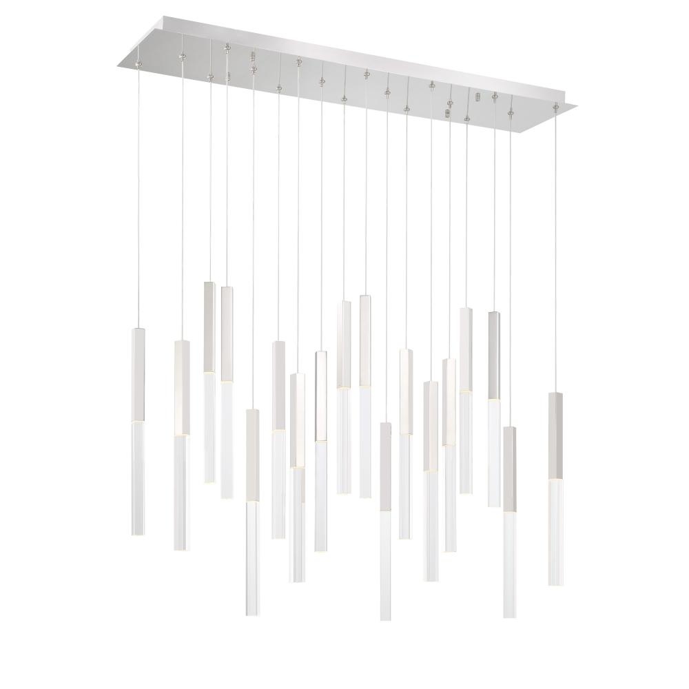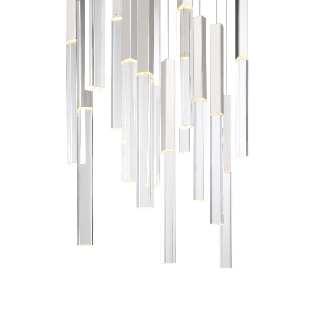 Its crystal rectangular prism and sharp beveled edges create brilliant illumination to the Benicio collection. Solid glass vertical spires cast vivid refractions across wall and ceiling surfaces. The thin simple geometric shape lends itself to luxurious and contemporary environments while providing a dual LED light source.