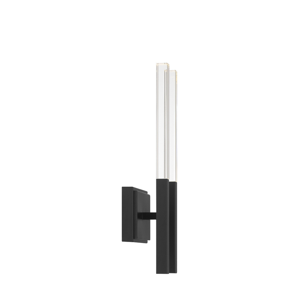 Its crystal rectangular prism and sharp beveled edges create brilliant illumination to the Benicio collection. Solid glass vertical spires cast vivid refractions across wall and ceiling surfaces. The thin simple geometric shape lends itself to luxurious and contemporary environments while providing a dual LED light source.